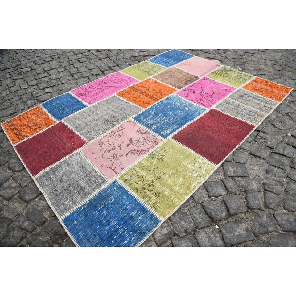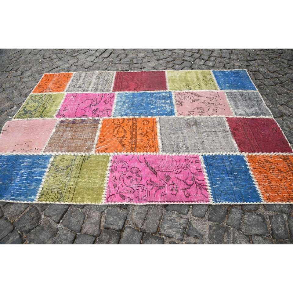 Alfombra Turca Vintage de 5.3x7.5 pies (161x229 cm), Alfombra de Lana Azul con Diseño de Patchwork