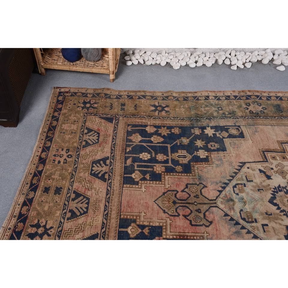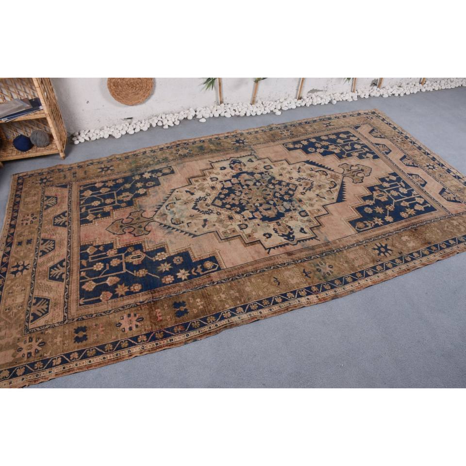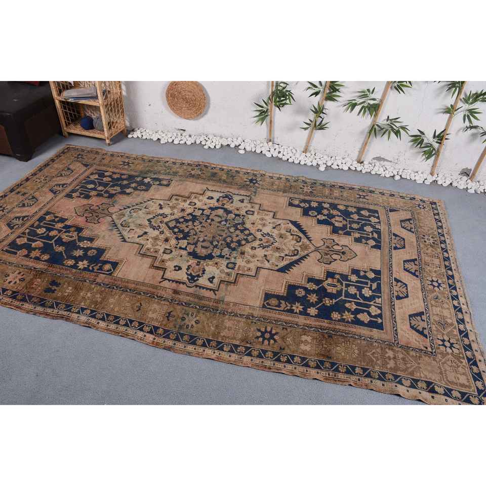 Alfombra turca Vintage de 5,7x10,2 pies, lana azul Beige hecha a mano con pelo de felpa, patrón abstracto Rectangular de altura para dormitorio
