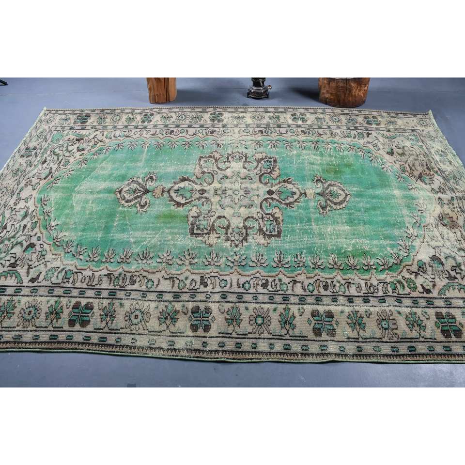 Alfombra turca vintage de 5,7x8,7 pies, diseño de retazos de lana verde y beige, respaldo de látex para el hogar, estilo rectangular, Tabriz