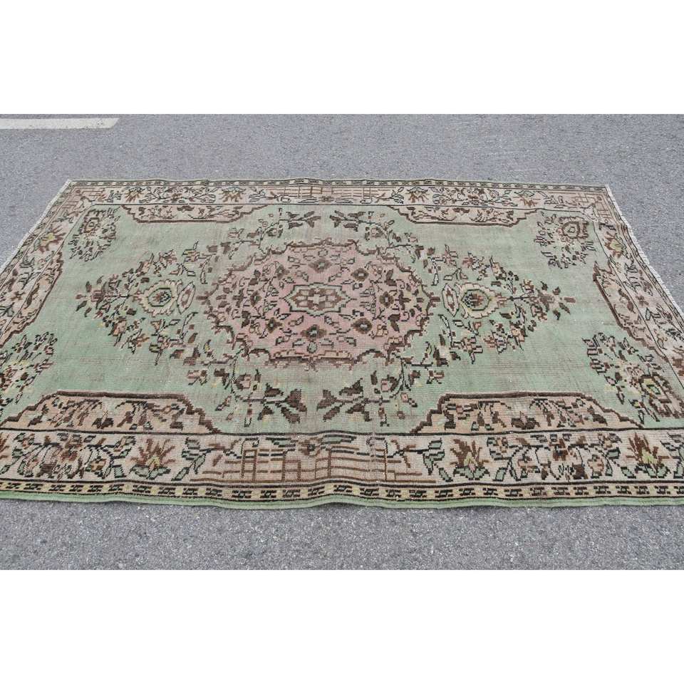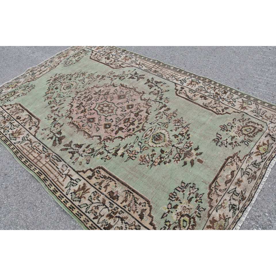 Alfombra turca vintage de 5,7x8,7 pies, alfombra tribal verde marrón de lana con retazos para sala de estar con respaldo de látex para adolescentes