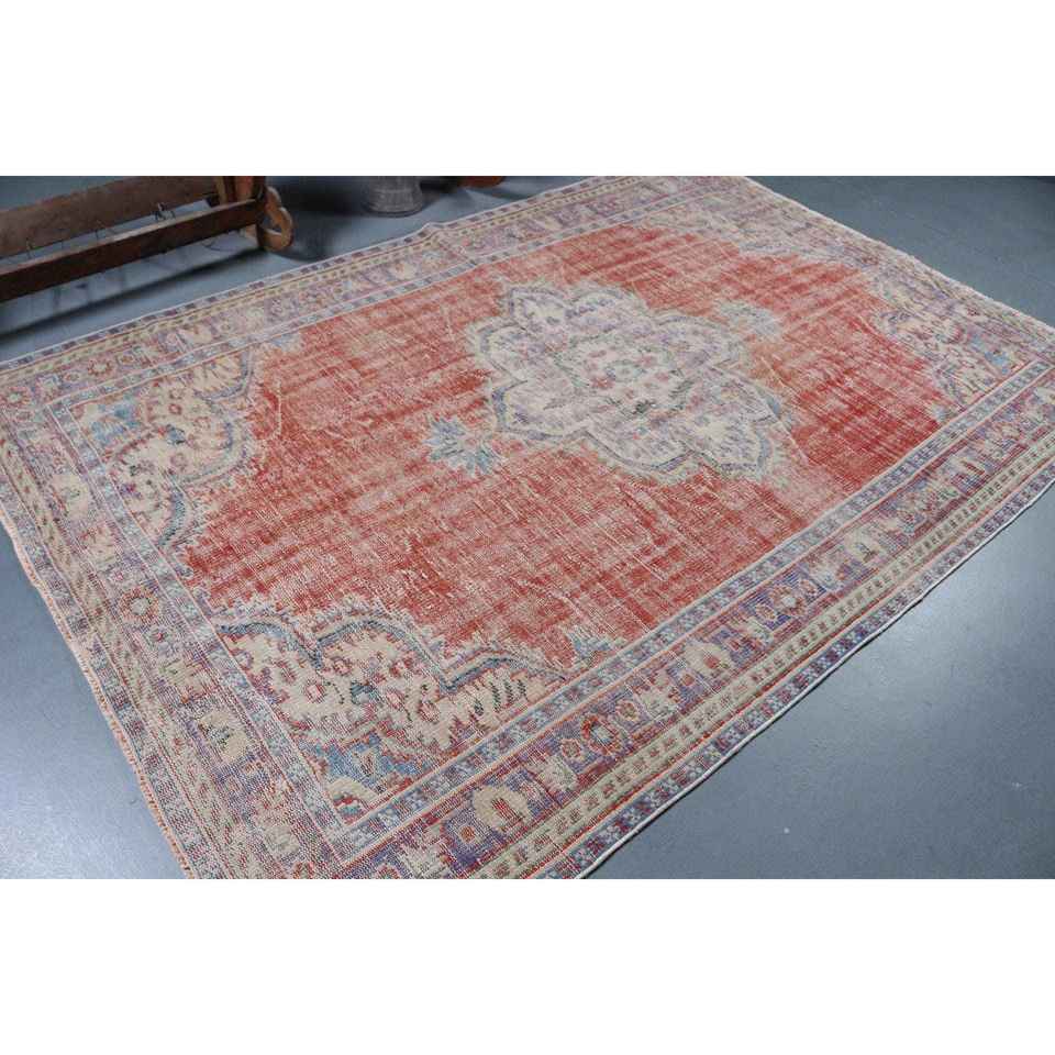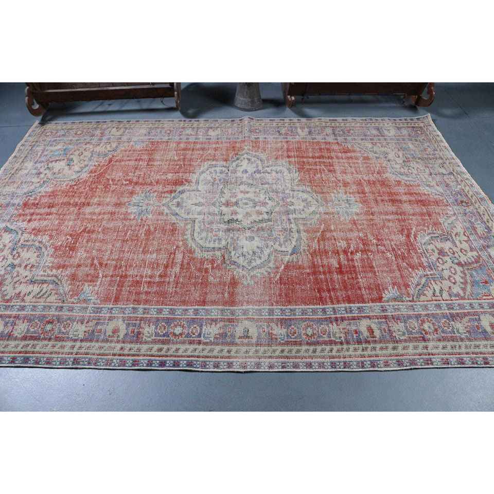 Alfombra Turca Vintage de 5.9x8.7 pies (181x265 cm), Alfombra con Borde Rojo