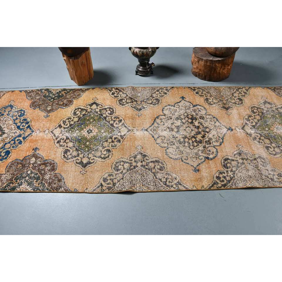 Alfombra turca Vintage Beige Azul 3,1X8,7 pies Lana hecha a mano con pelo de felpa Altura Forma rectangular Patrón abstracto para dormitorio