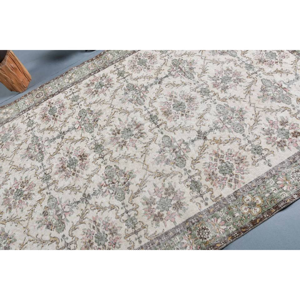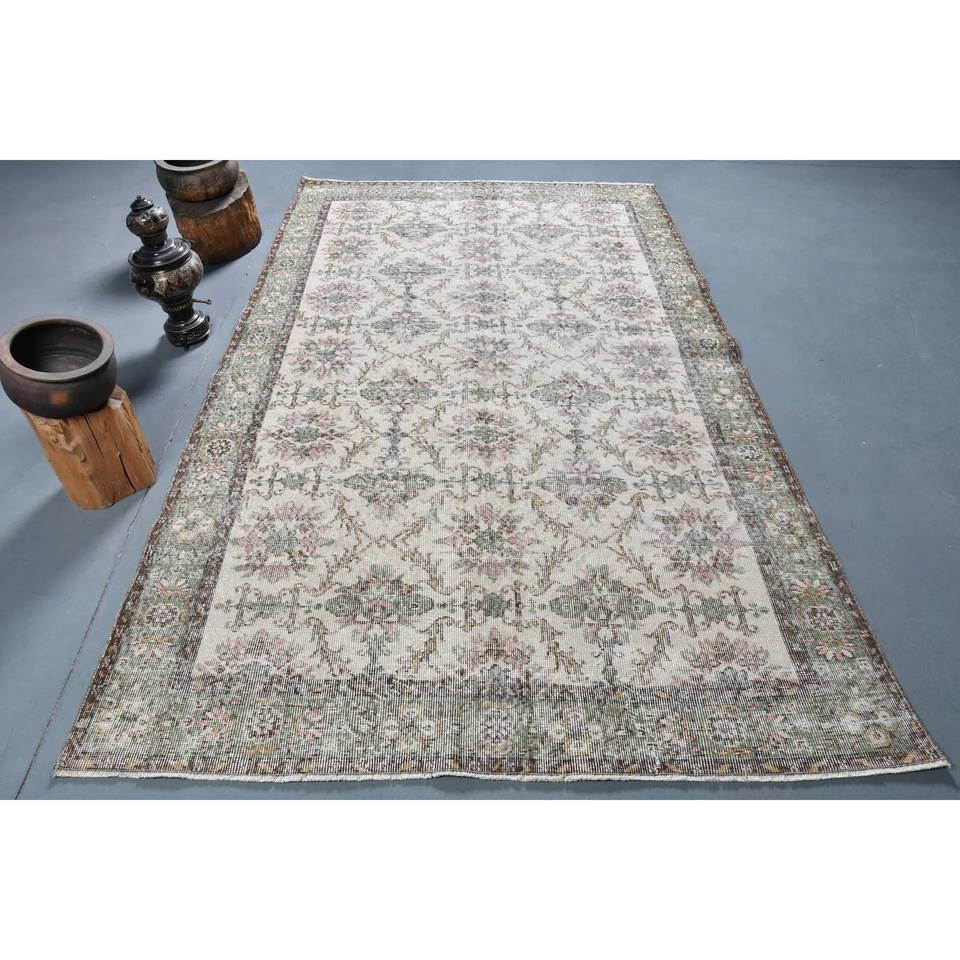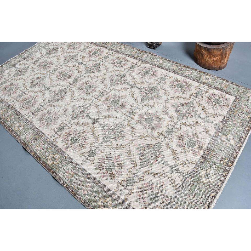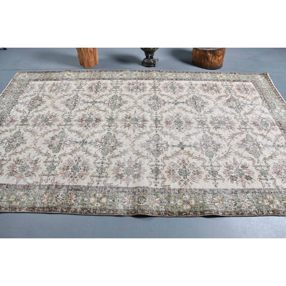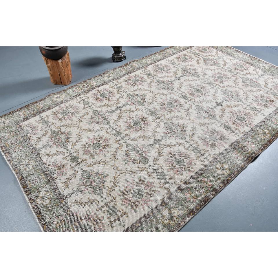 Alfombra Turca Vintage Ecológica, Tradicional, Beige y Verde, 5.3 x 9.1 pies, Tejido Plano de Lana, Diseño de Patchwork, Decoración para Sala de Estar