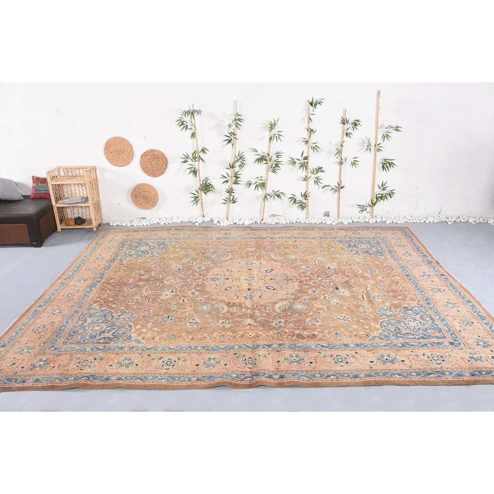 Alfombra turca vintage clásica marrón azul 9,8X13,1 pies hecha a mano pelo de felpa forma rectangular Tabriz Patchwork lana poliéster látex