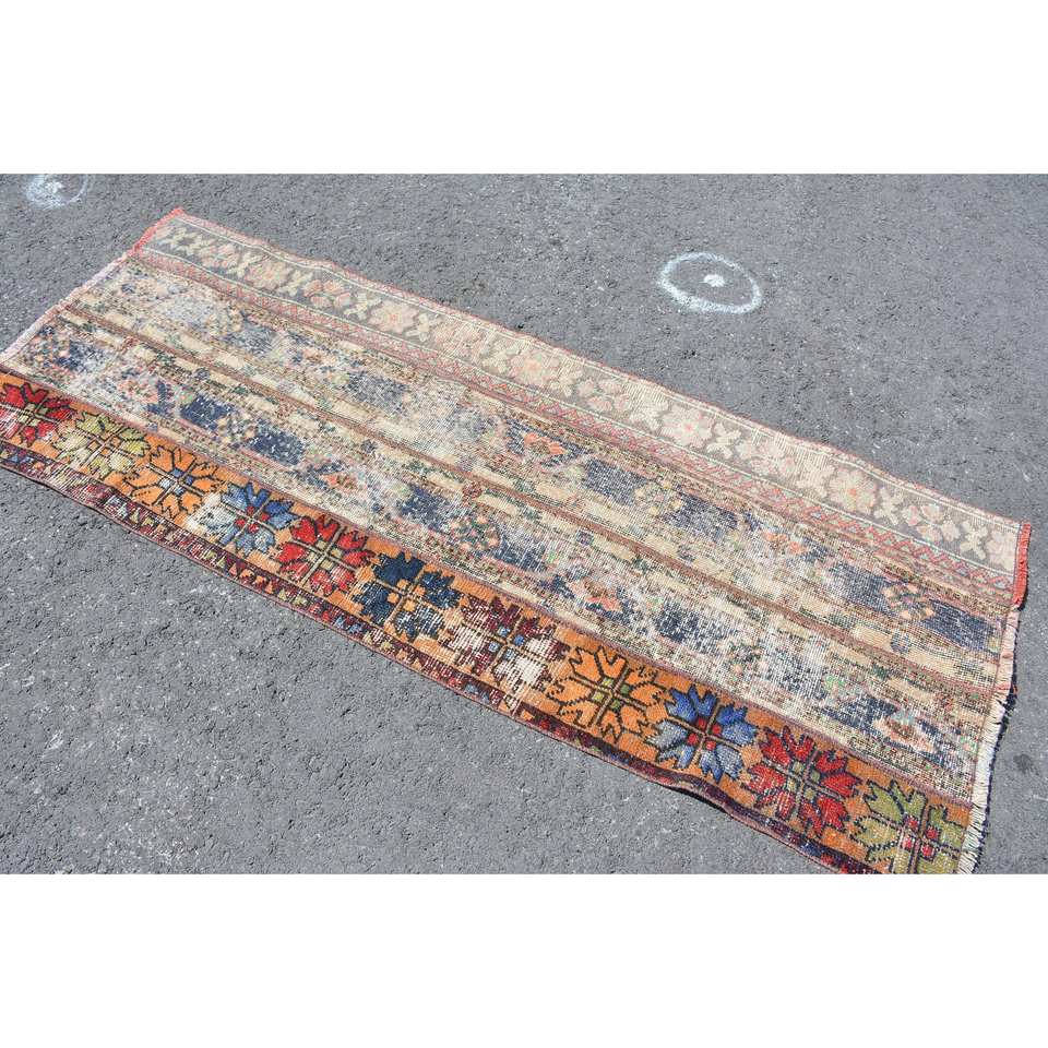Alfombra turca Vintage clásica naranja azul Patchwork diseño hecho a mano lana látex respaldo 2.6x6.7ft gran rectángulo felpa para pasillo