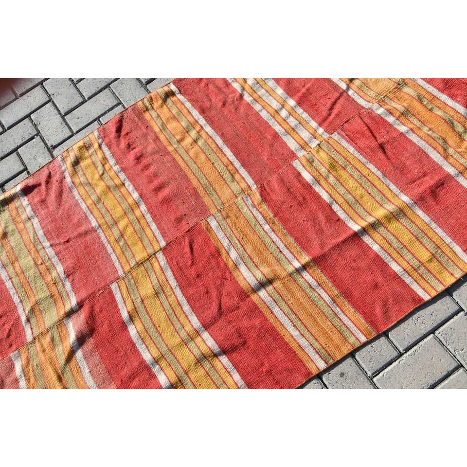 Alfombra turca vintage ecológica de pelo medio rústico rojo naranja 3,5x6,6 pies área grande diseño de retazos comedor lana látex