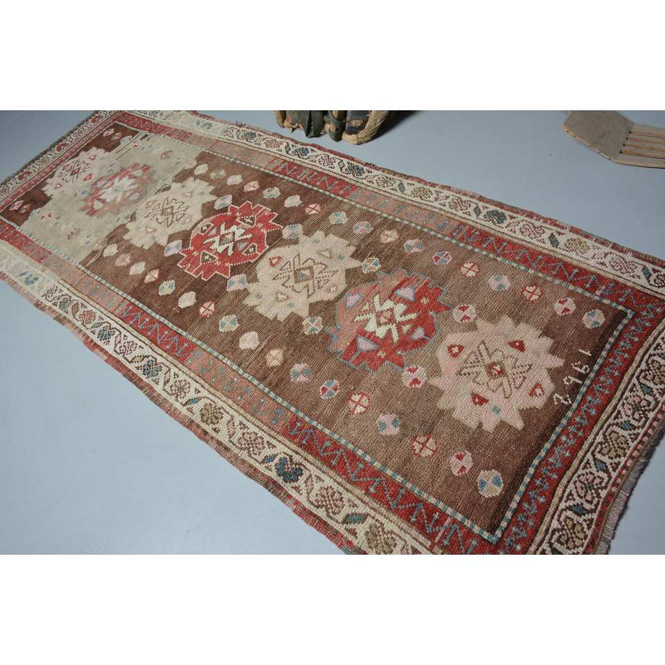 Alfombra turca vintage de área grande de 3,8x9,3 pies, material de lana beige marrón clásico, retales de látex para pasillo, alfombra rectangular para cabecera