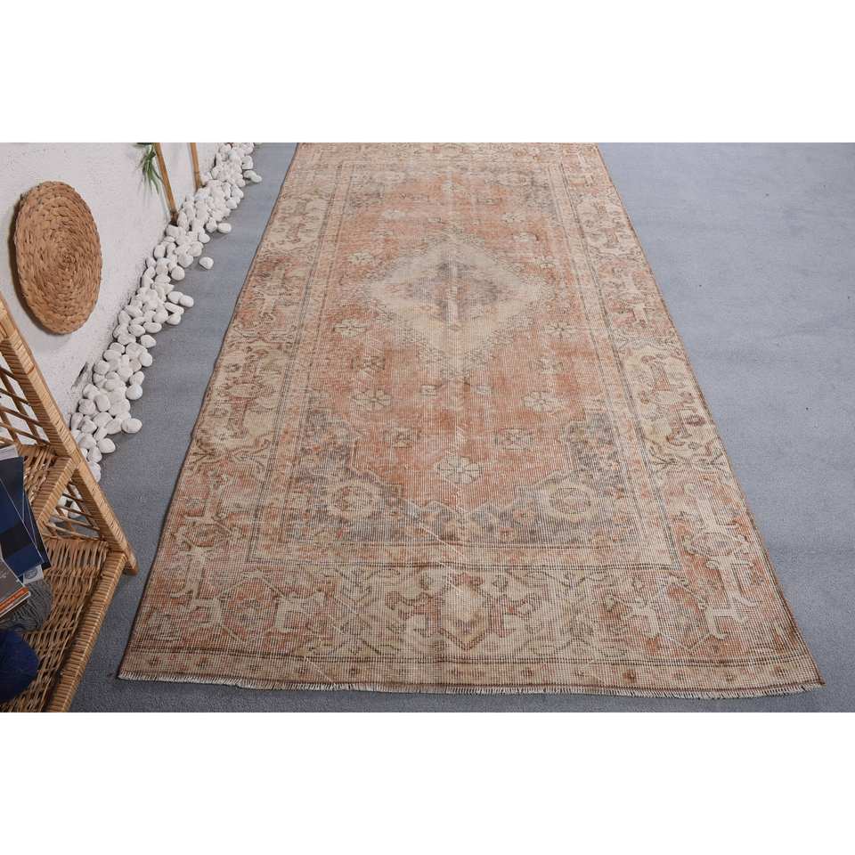 Alfombra turca vintage de área grande, diseño de retazos rectangulares de 4,4X8,3 pies, patrón abstracto, látex de lana naranja y Beige para uso en el pasillo