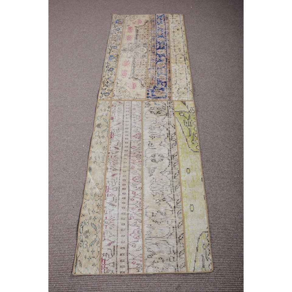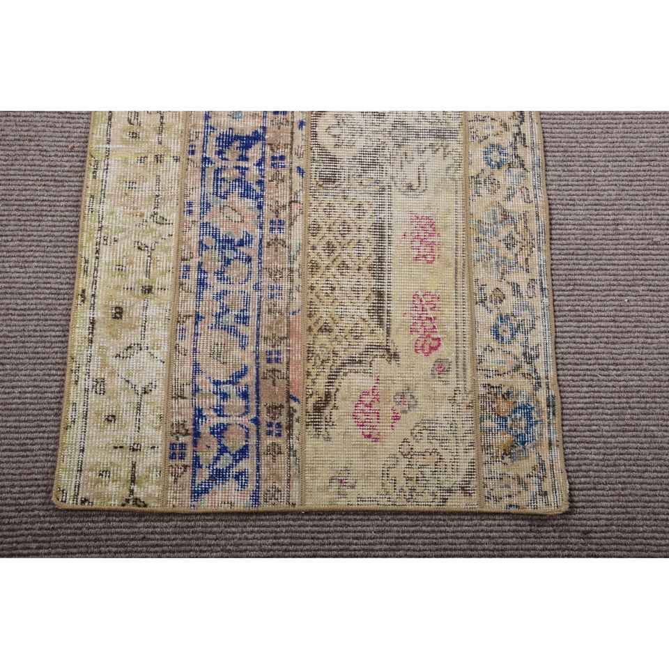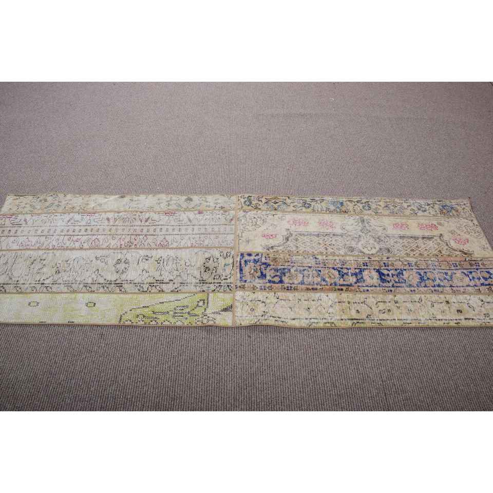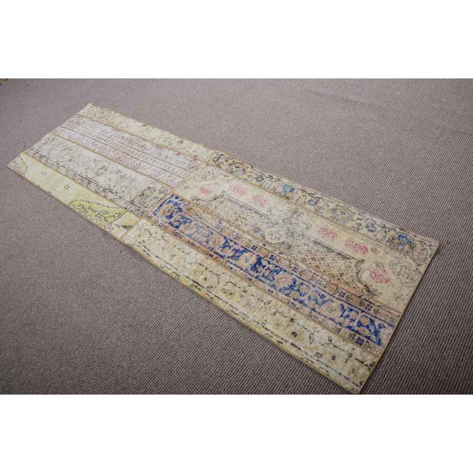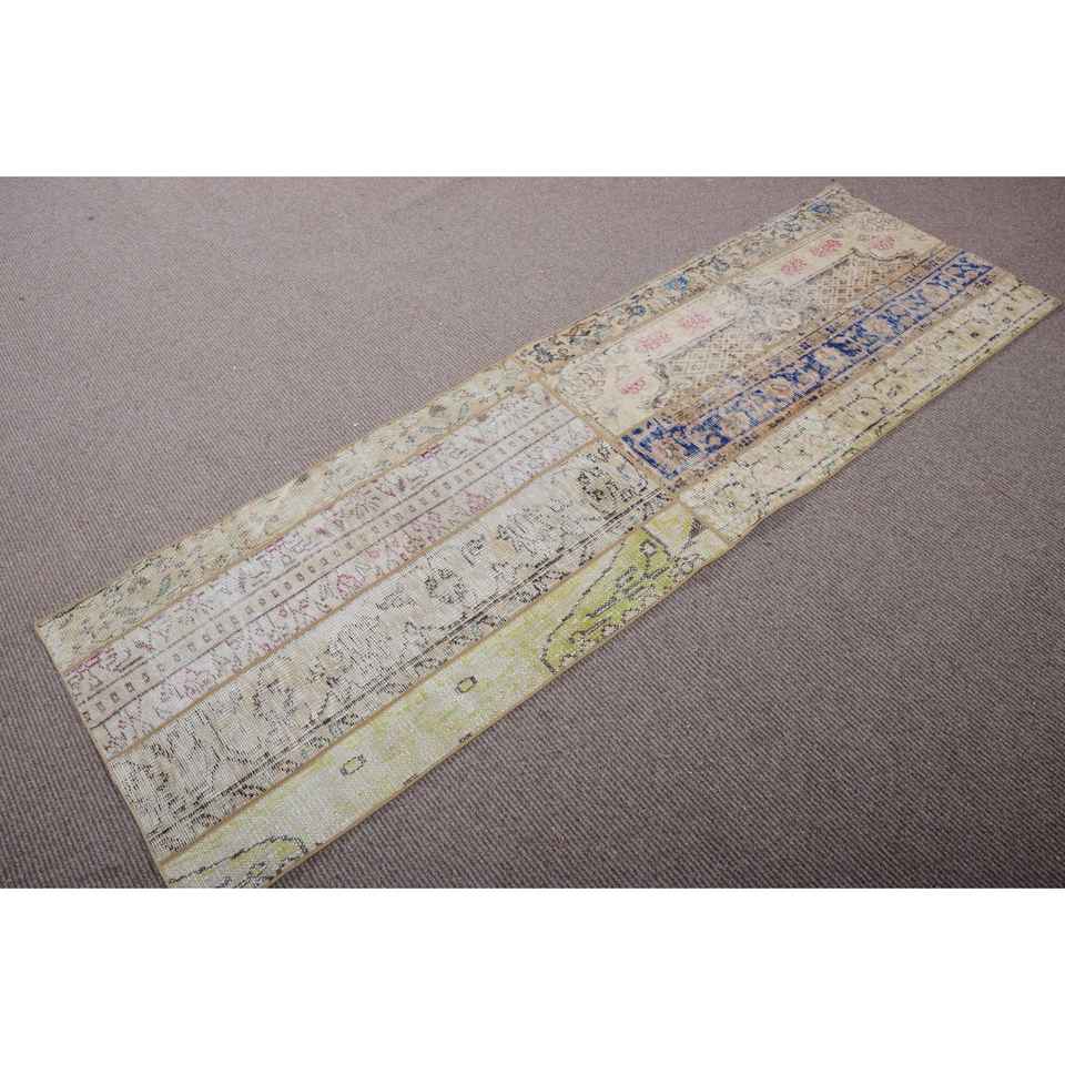 Alfombra Turca Vintage de 2,3x7,3 pies, Alfombra de Lana con Bordes Azul Verde