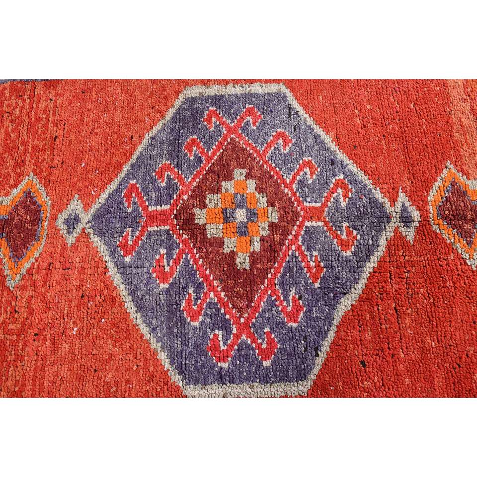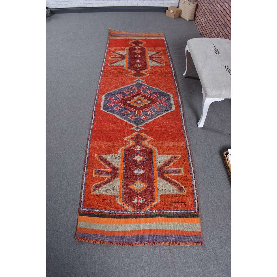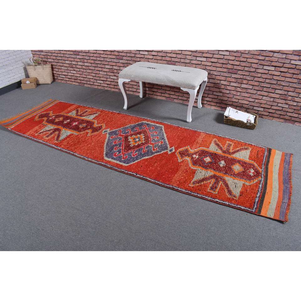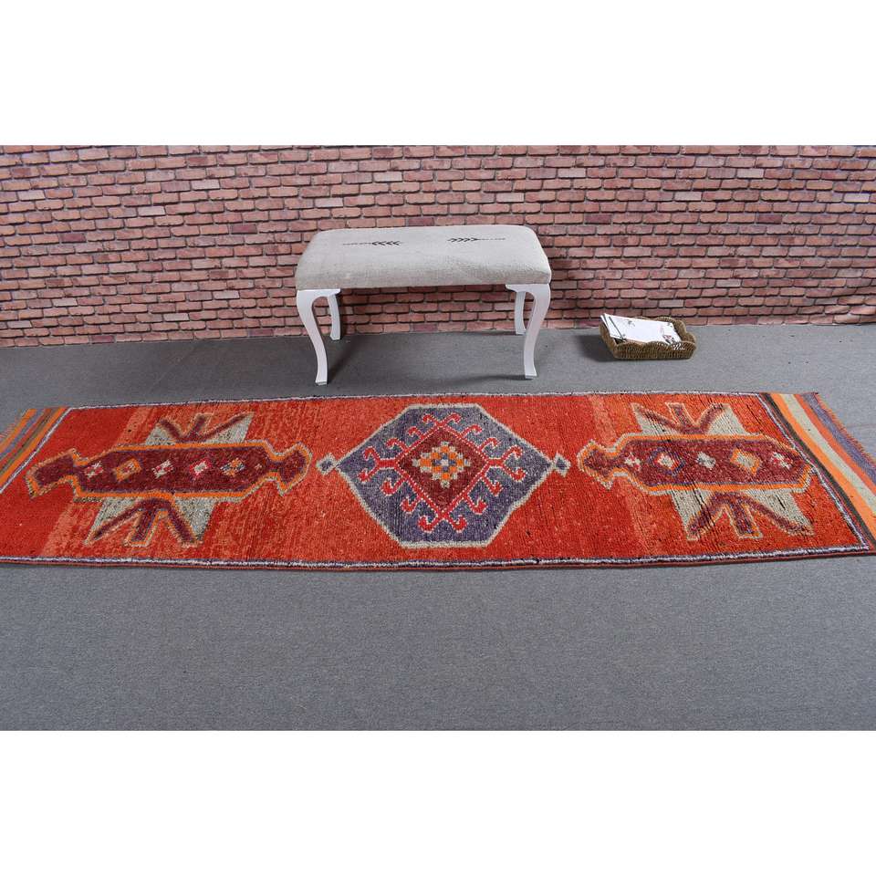 Alfombra Turca Vintage de 2.9x9.7 pies, Alfombra con Estampado Animal en Rojo y Azul