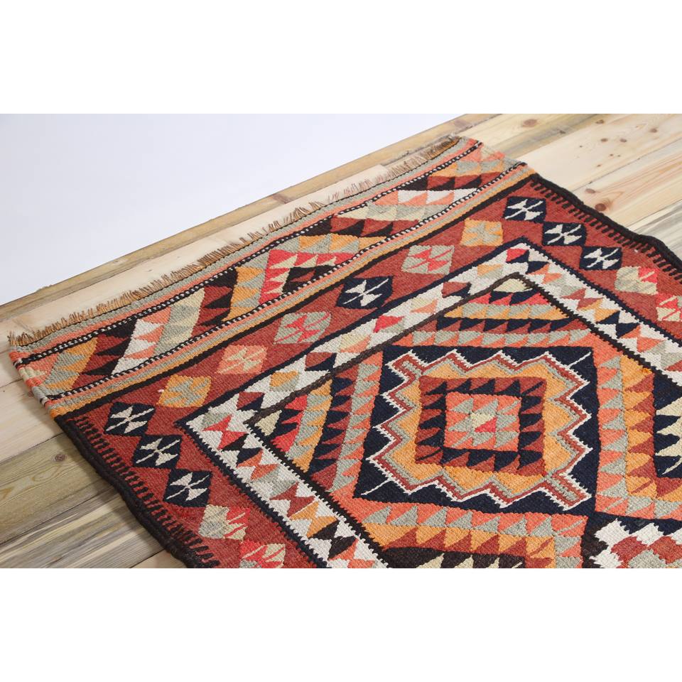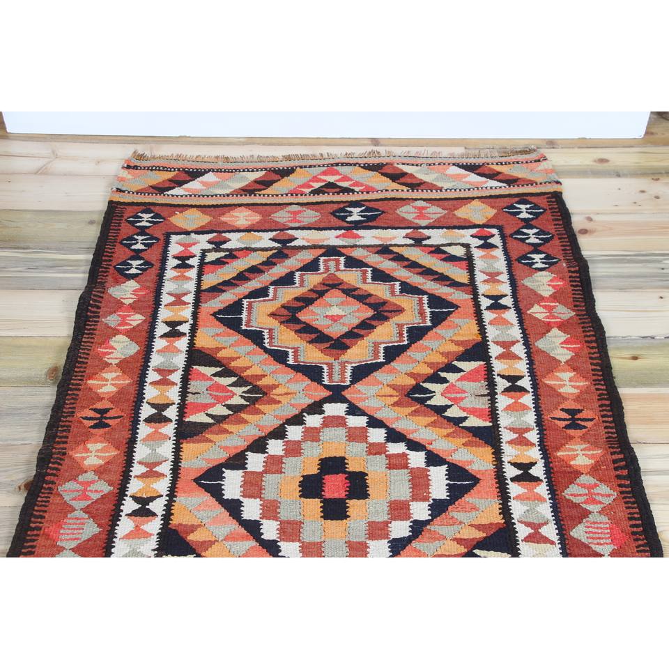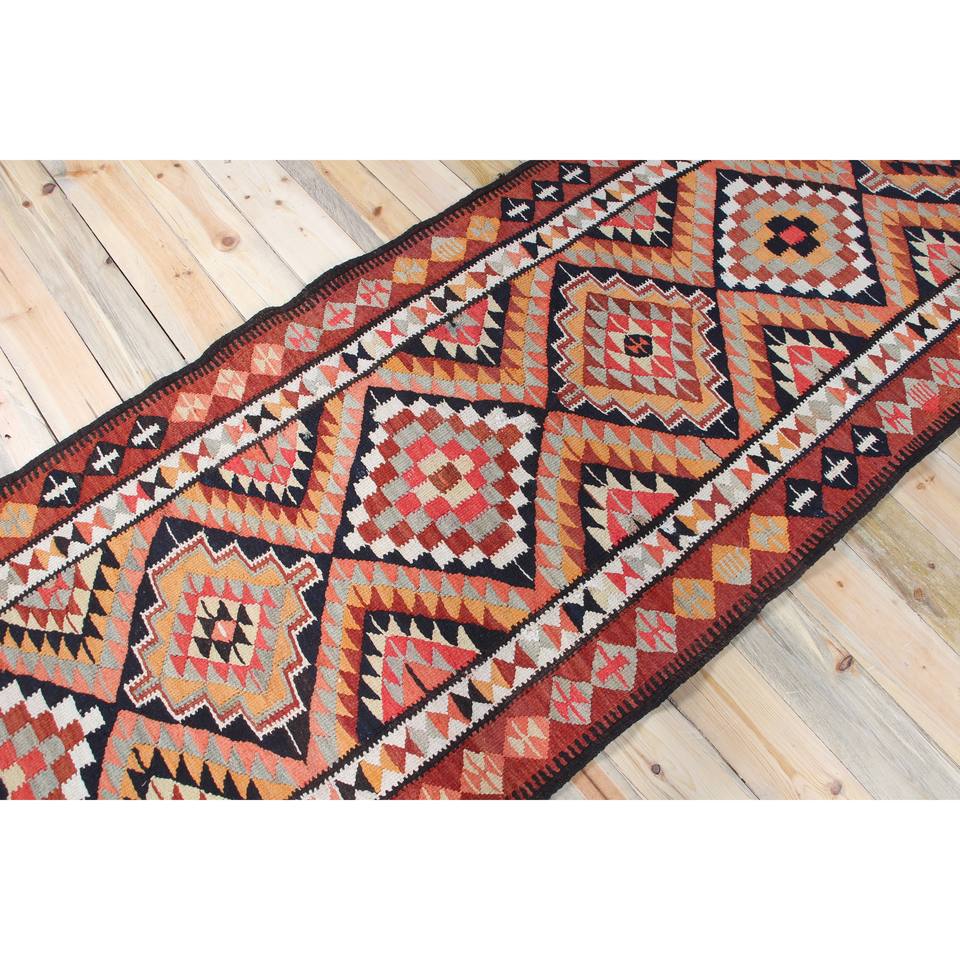 Alfombra Turca Vintage de 3.3x13.1 pies, Alfombra de Lana Geométrica Marrón y Rosa