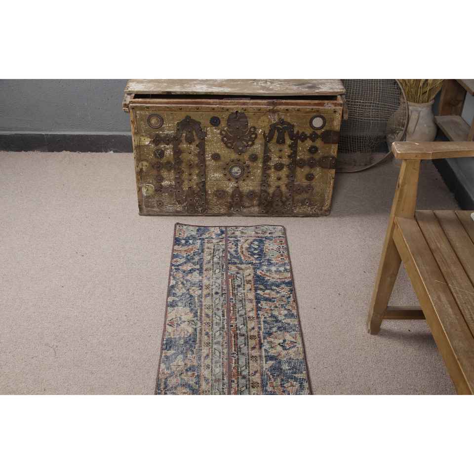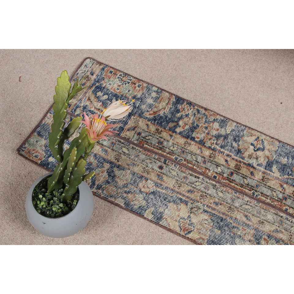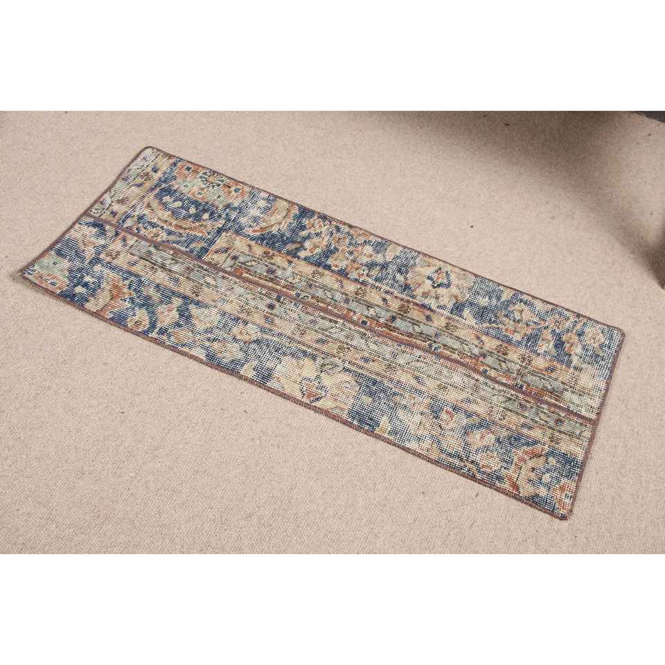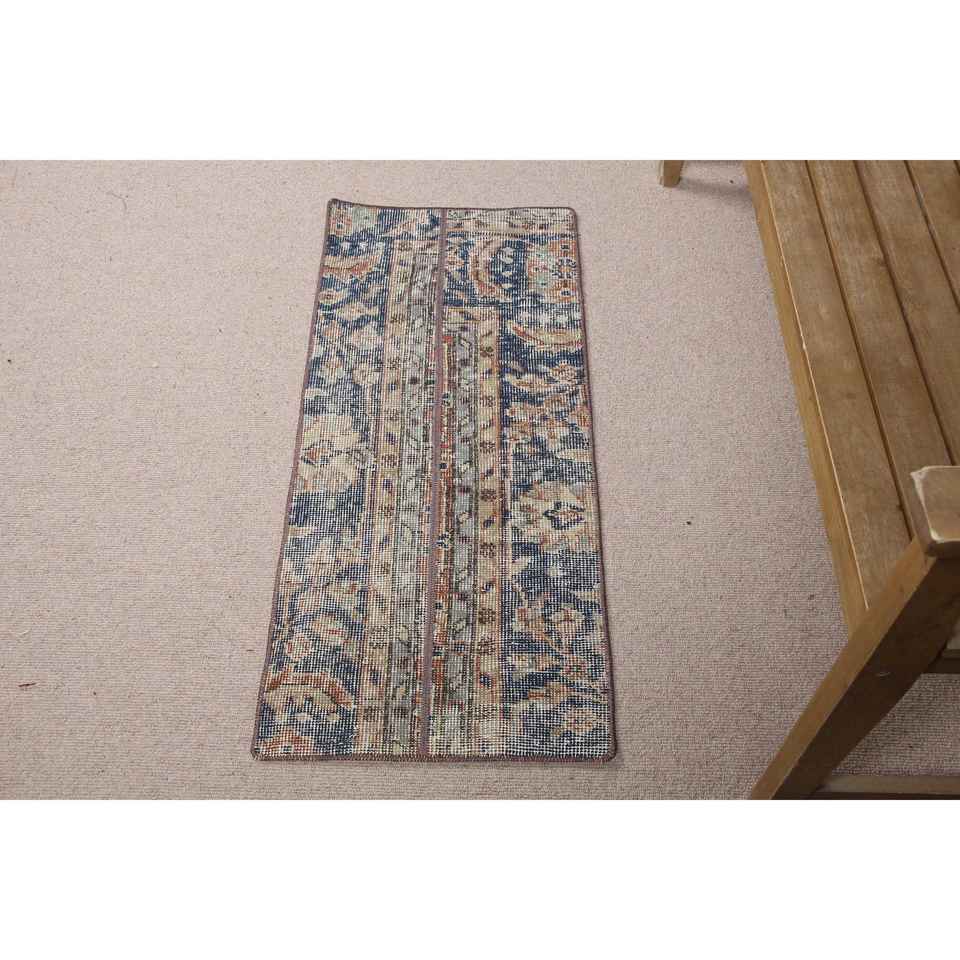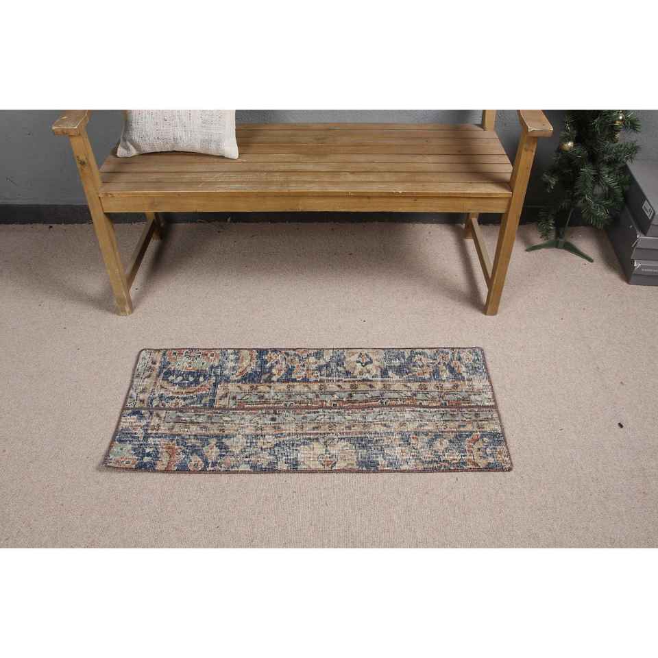 Alfombra Turca Vintage de Lana Ecológica de 1.5x3.4 pies, Diseño de Parches Azul y Marrón con Base de Látex