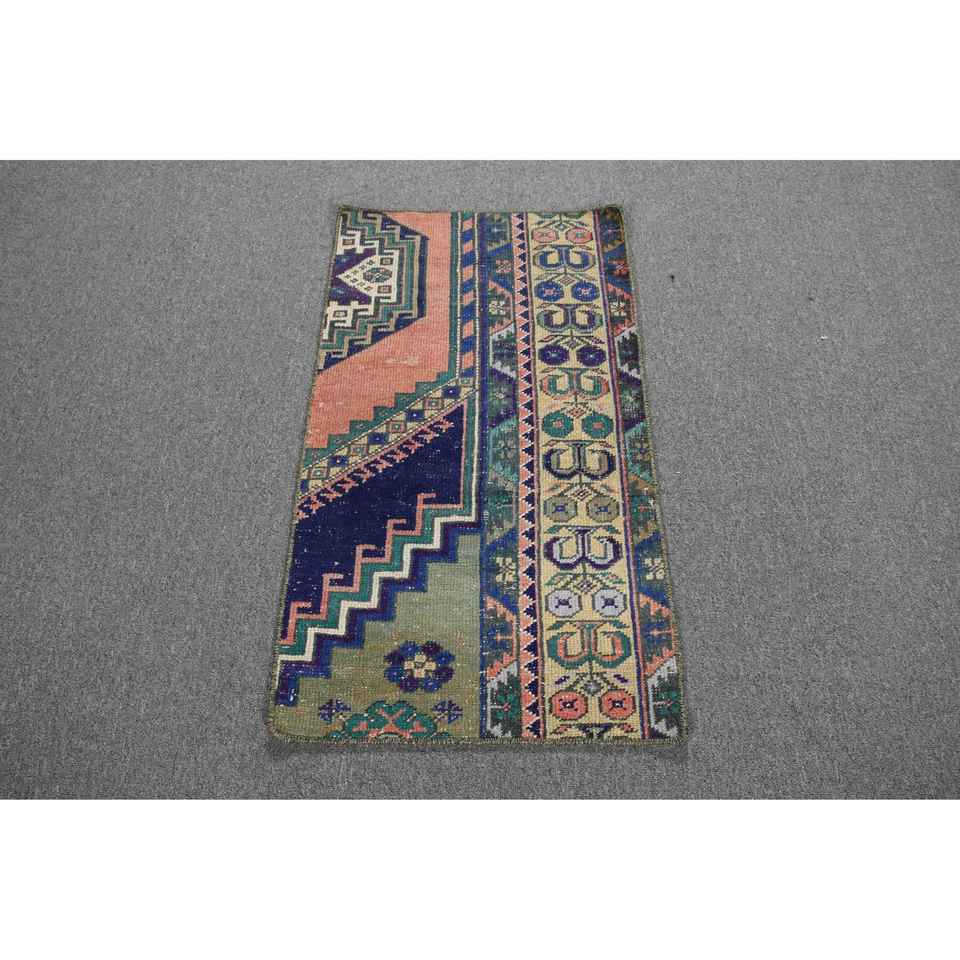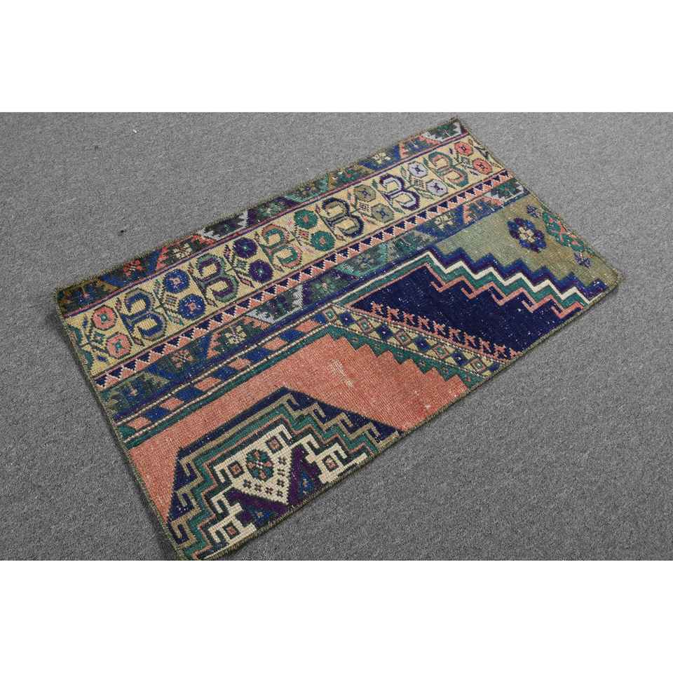 Alfombra Turca Vintage Pequeña de 1.7x3 pies, Alfombra de Lana Sólida Azul y Roja