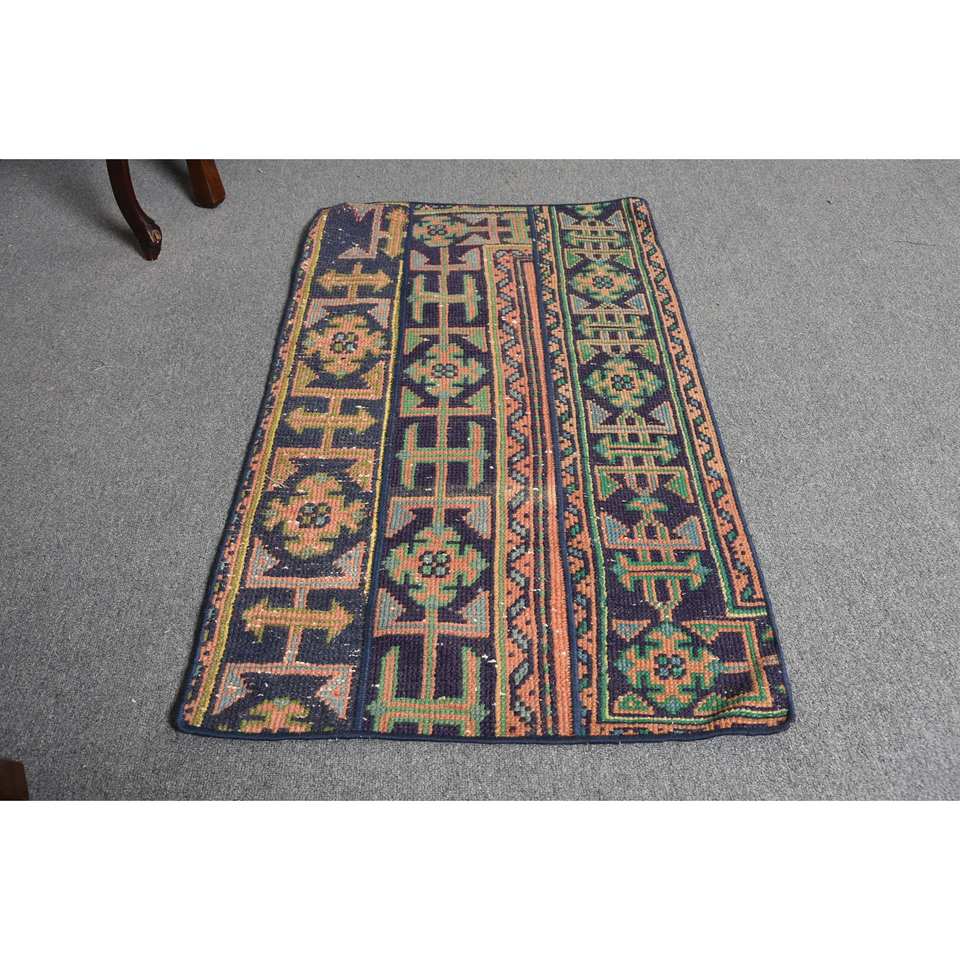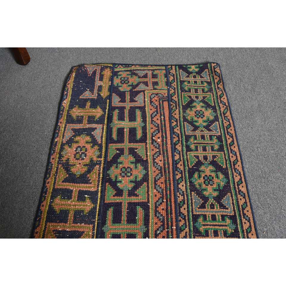 Alfombra Turca Vintage de Lana, 2 x 3.6 pies, Verde Naranja, Diseño de Patchwork, Tejido Plano, Ecológica, Decoración Tradicional para Comedor
