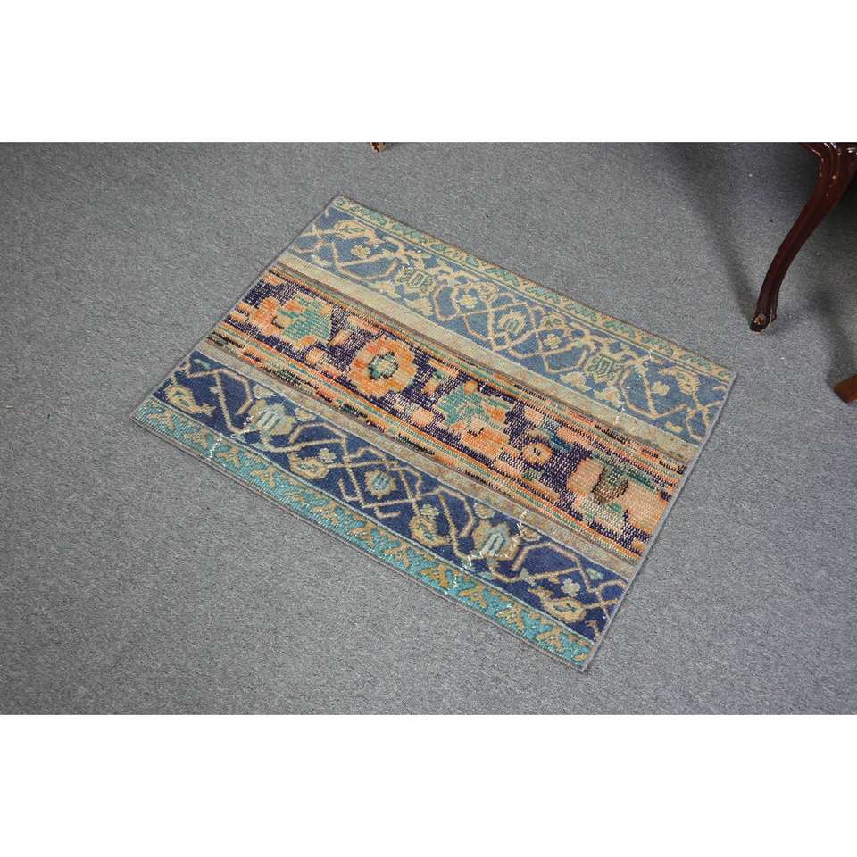 Alfombra de lana turca vintage de 2x2,7 pies, tejido plano de gran tamaño, respaldo de látex, diseño de retazos azul naranja para decoraciones de sala de estar