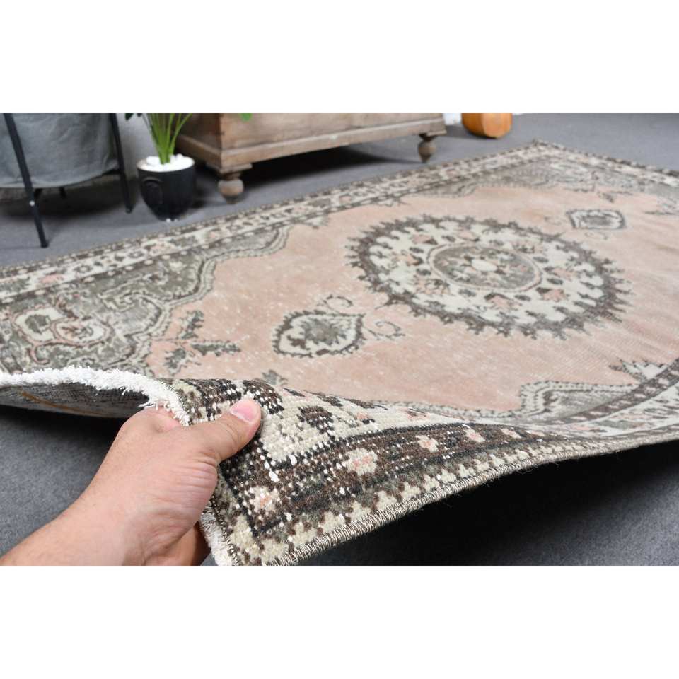 Alfombra Tradicional Turca Vintage de Lana Ecológica, Diseño de Parches Beige y Verde, Gran Tamaño 5' X 8' 7', Rectangular con Respaldo de Látex