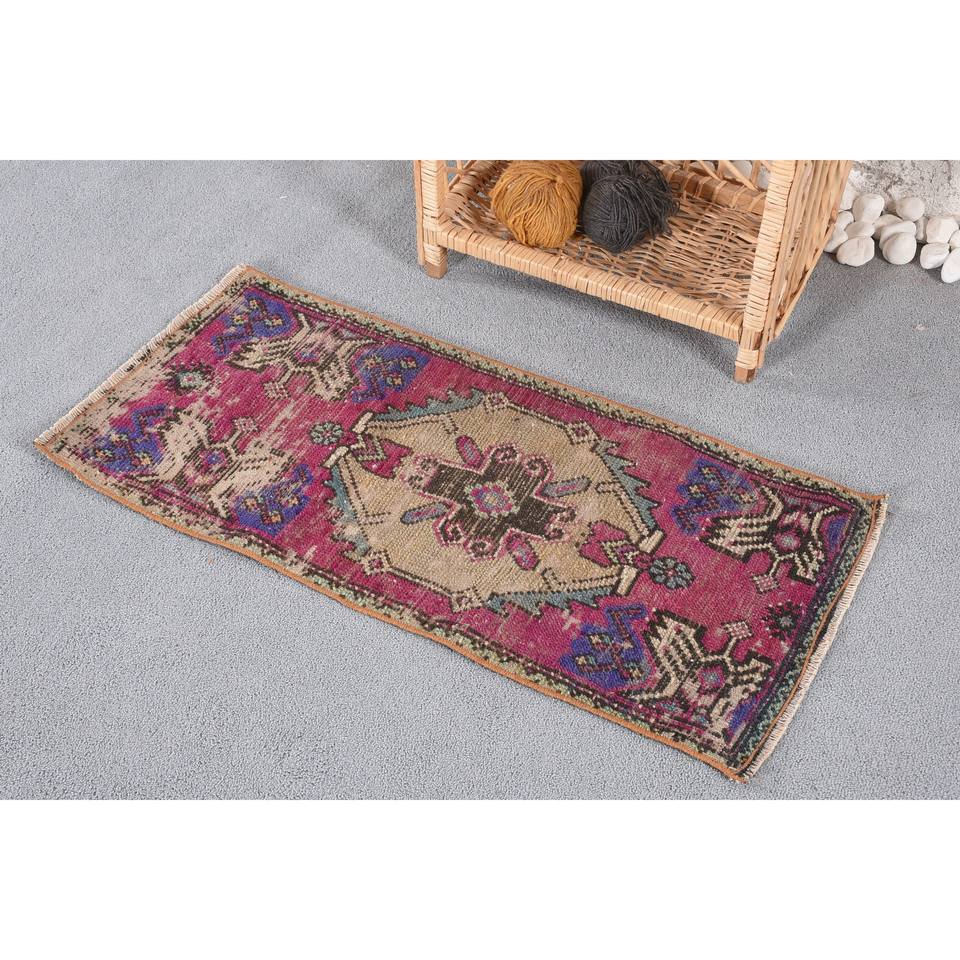 Alfombra de lana Vintage 1,4X3,1 pies (44x94 cm) estilo patchwork rosa azul látex respaldo 10mm alfombra de felpa para pasillo 9x12