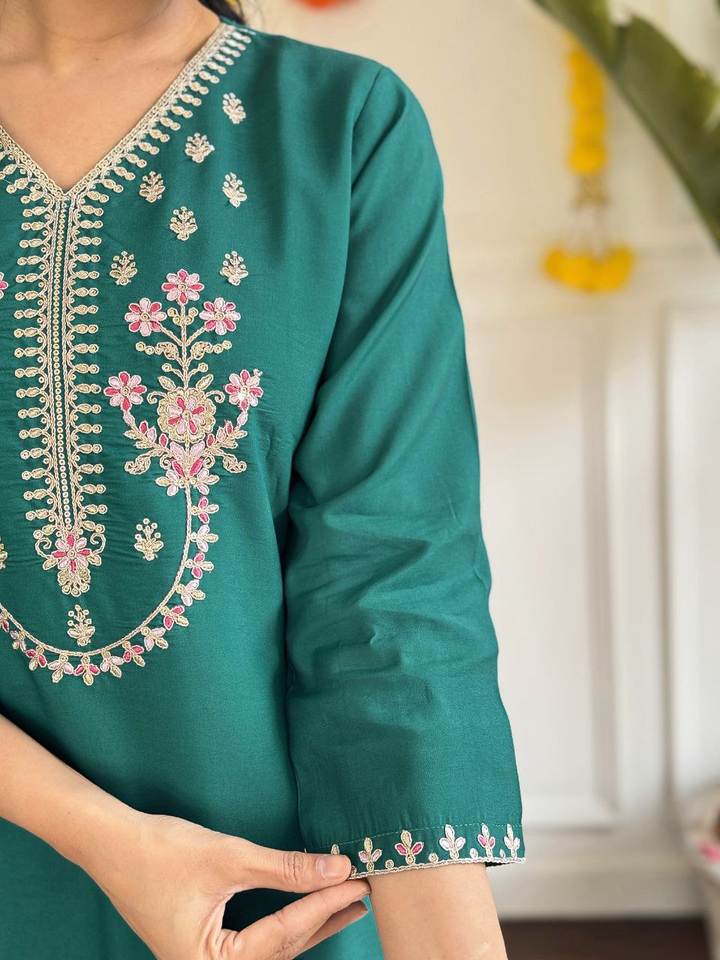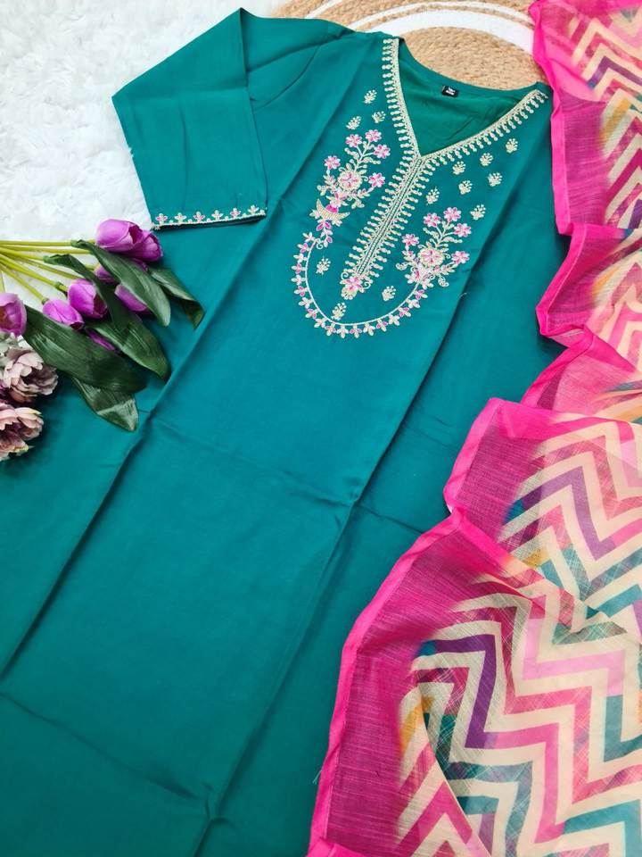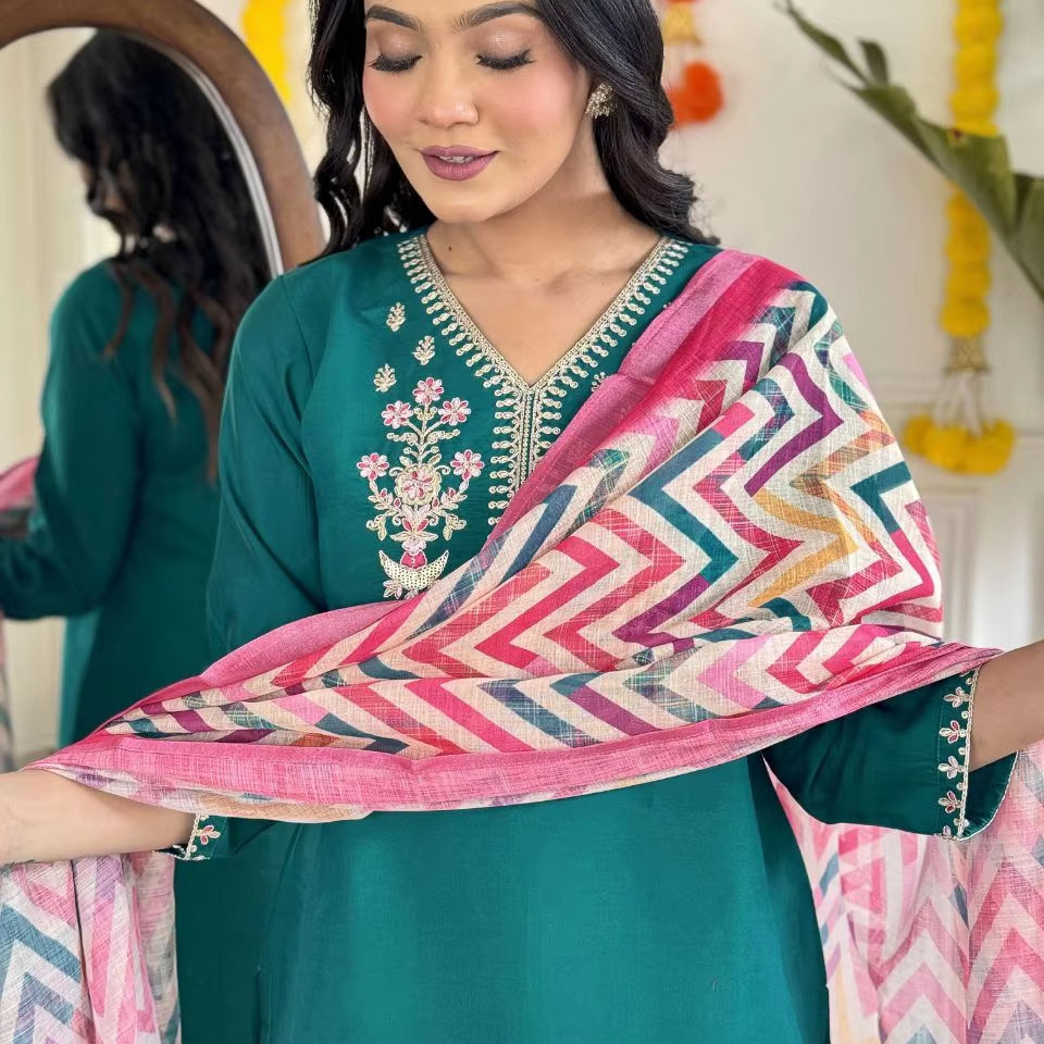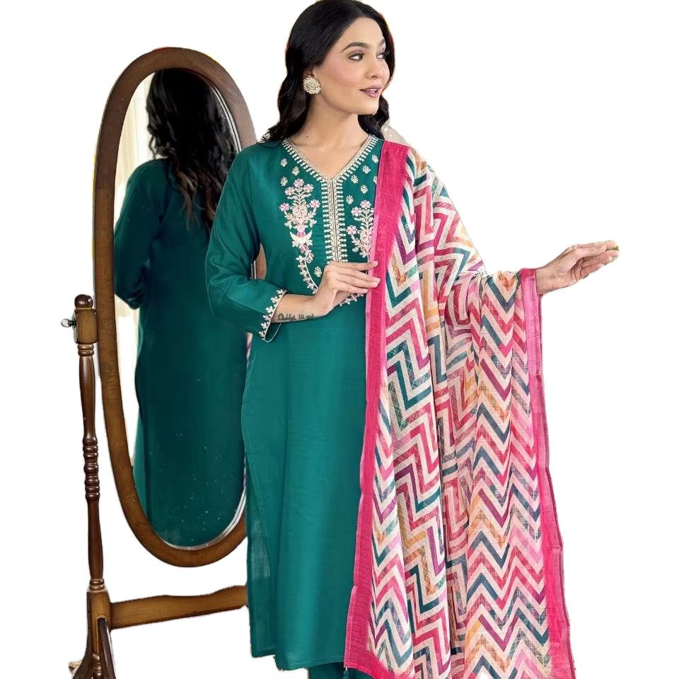 Conjunto de Kurti y Pantalón de Seda Tradicional Kota con Cuello en V y Largo hasta la Rodilla con Dupatta en Contraste para Mujer