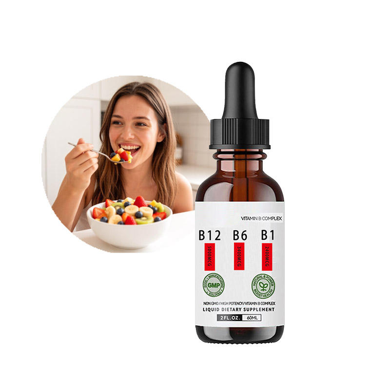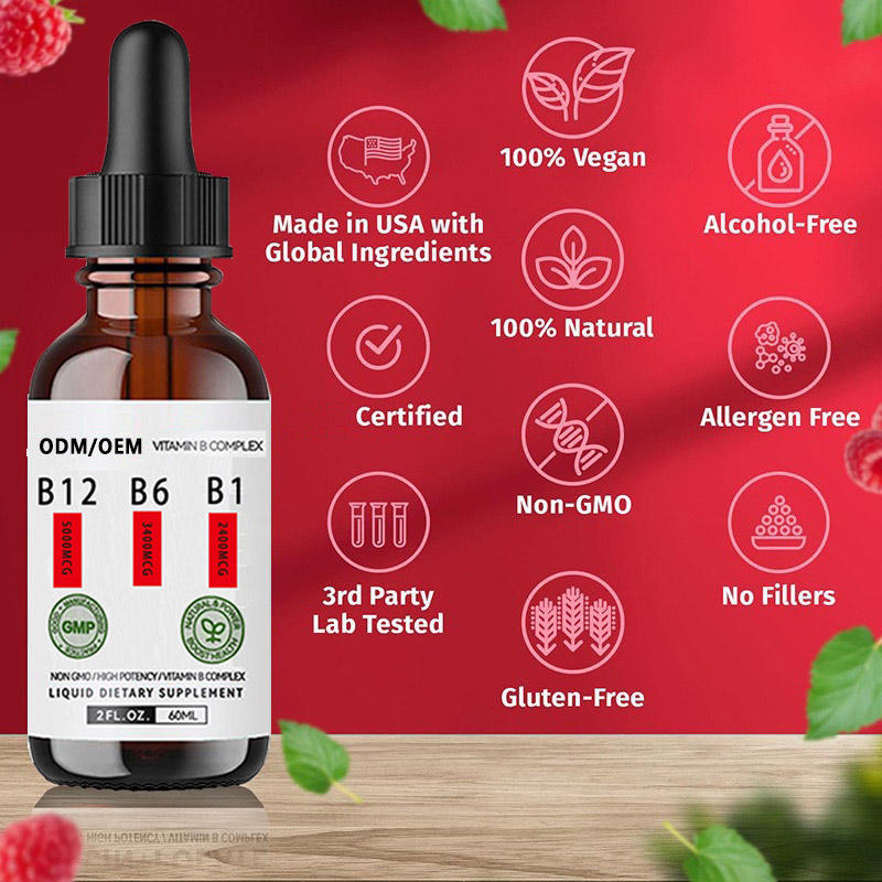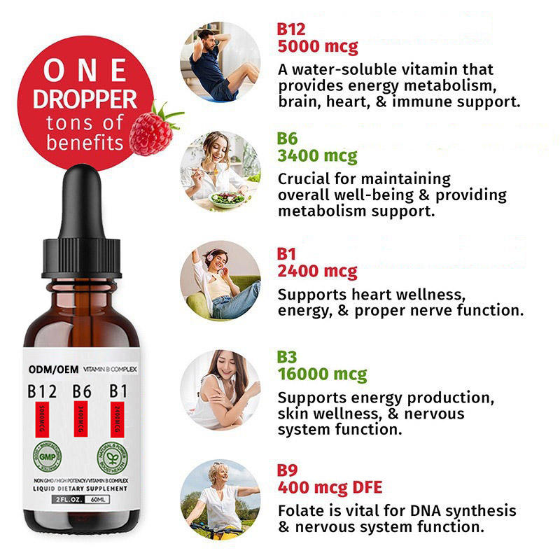 Gotas Líquidas de Complejo de Vitamina B 60ml con B12 5000mcg, B6 3400mcg, B1 2400mcg, Niacina, Folato, 100% Vegano, Sin GMO, Sin Alcohol