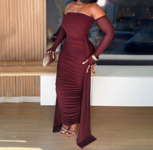 Viviblook J25DS416 Vestido Largo de Noche para Mujer, Nuevo Modelo de Invierno, Color Sólido, Hombros Descubiertos, Manga Larga, Malla con Volantes