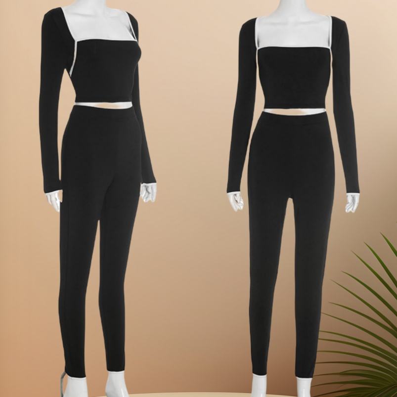 Viviblook Q25ST294 Conjunto de dos piezas informal para mujer Otoño Cuello cuadrado Lado Manga larga Top Ajustado Conjunto de pantalones de cintura alta