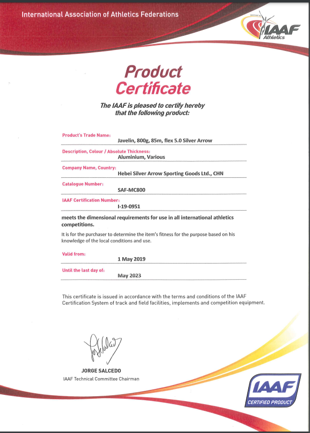 Jabalina de Competición de Atletismo Certificada por la WA para Hombre, 800g, 85M, Calidad Garantizada con 3 Años de Garantía, Precio de Fábrica