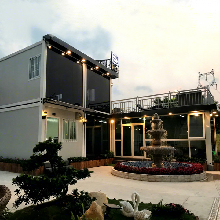 Detalles del embalaje:Con techo y suelo completos, las columnas, ventanas, puertas y lámina de decoración están empaquetadas con película de plástico.
