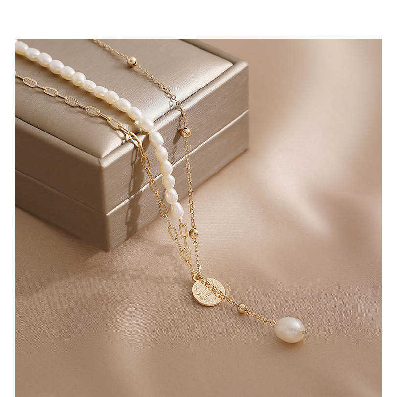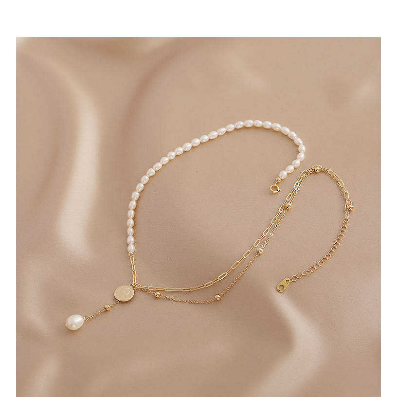 Collar de Cadena Doble Apilada WENCHI con Perla Natural de Agua Dulce de 450g, Diseño en Capas a la Moda