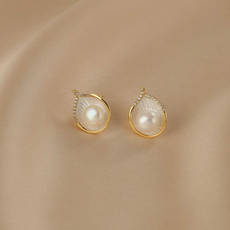 Pendientes de Botón de Plata de Ley S925 WENCHI, Diseño Elegante con Perla Natural y Concha, Modelo 1602