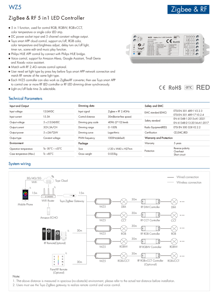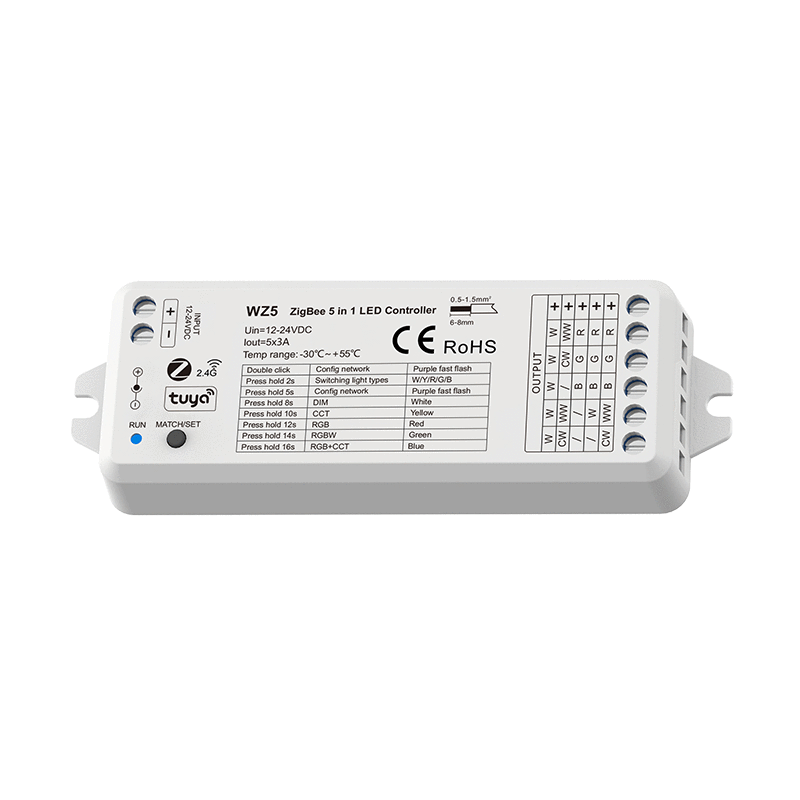 Controlador LED WZ5 Tuya ZigBee y RF 5 en 1, Utilizado para Ajustar el Brillo, RGB, RGBW, RGB+CCT, Doble Color, Color Único, Regulador de Intensidad para Tiras LED