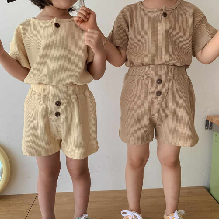 Conjunto de dos piezas para niñas: Camiseta de algodón con cuello redondo y pantalones cortos tipo waffle con botones, estilo coreano.