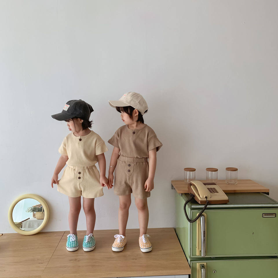 Conjunto de dos piezas para niñas: Camiseta de algodón con cuello redondo y pantalones cortos tipo waffle con botones, estilo coreano.