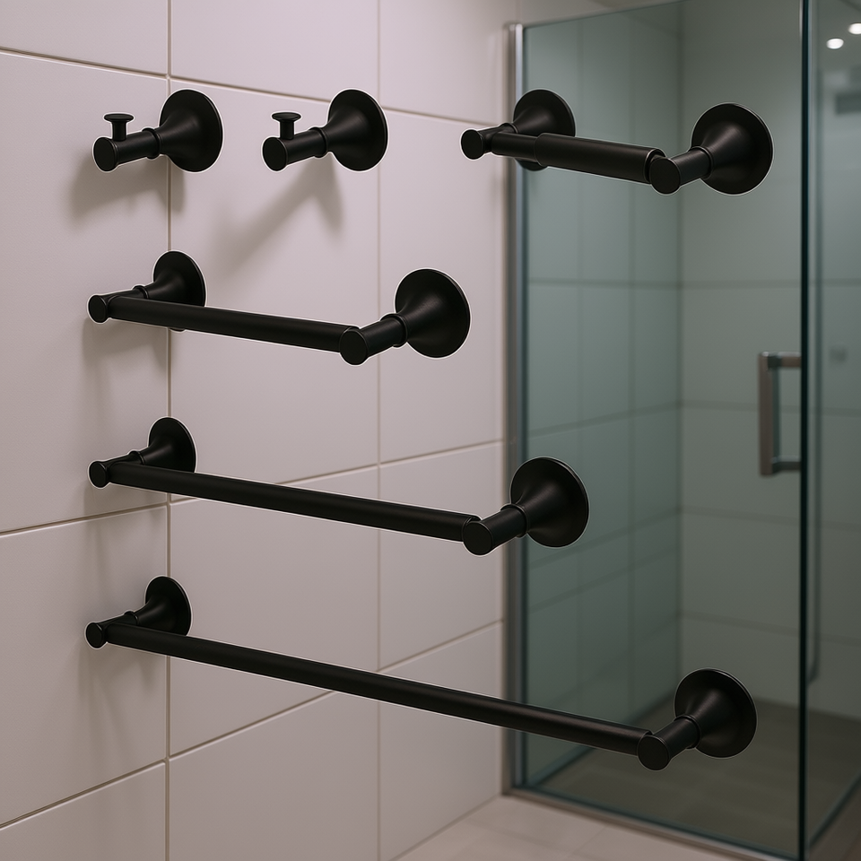 Juego de Toallero de Pared de Latón Negro Mate, 6 Piezas, Accesorios de Baño de Diseño Moderno, Forma Lineal