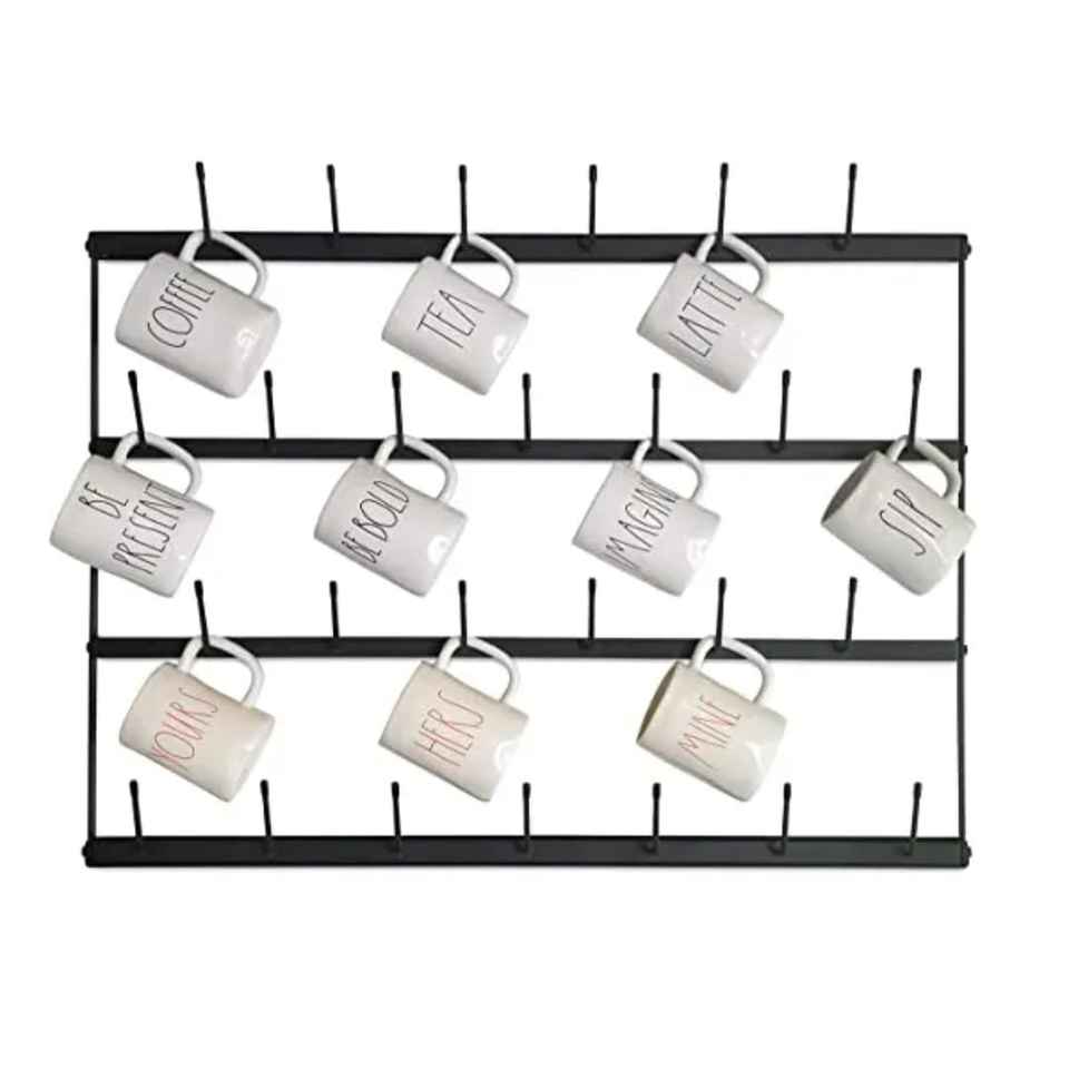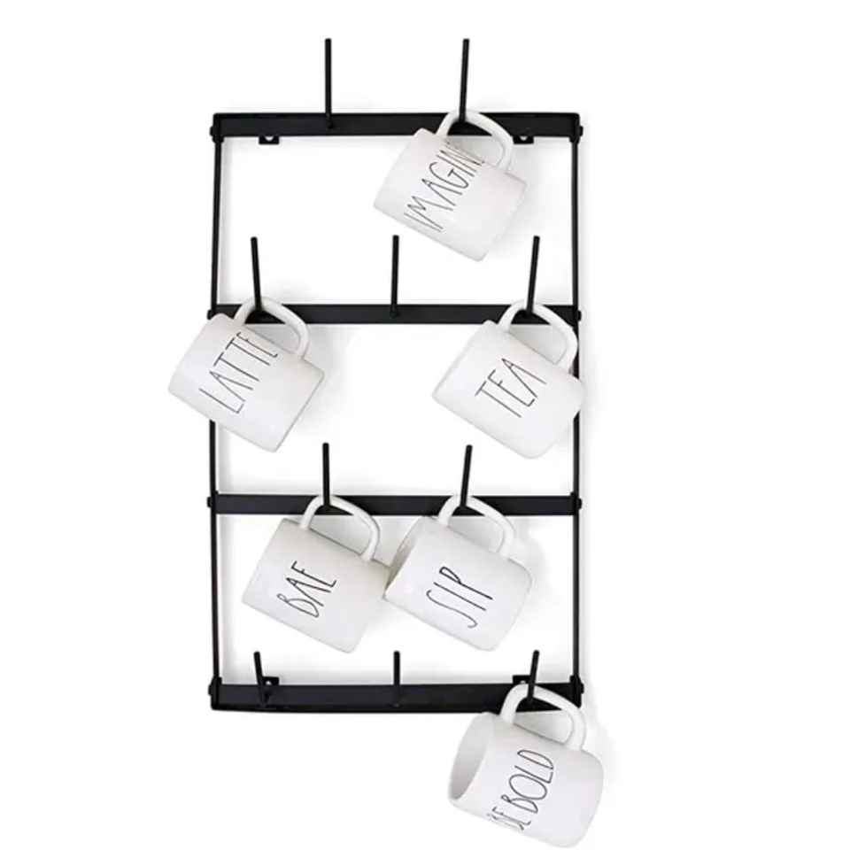 Portavasos de Pared con Marco de Metal Negro, Capacidad para Diez Tazas de Cerámica, Organizador de Cocina para Café y Té, Elegante, Moderno y en Tendencia