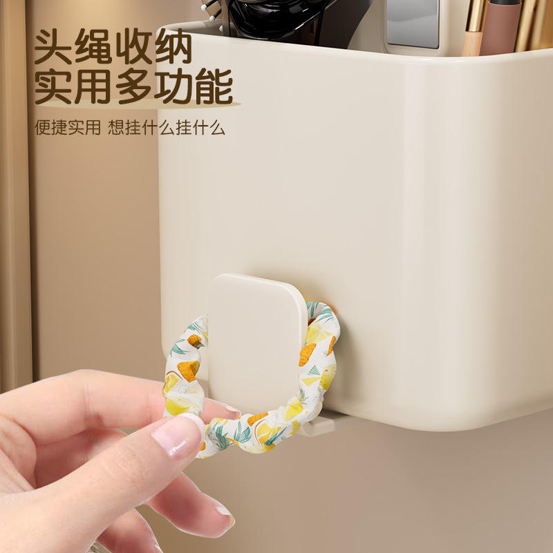 Contenedor de almacenamiento montado en la pared con ganchos para baño, cepillo de dientes, pasta de dientes, maquinilla de afeitar y organizador de joyas, diseño rectangular sin perforaciones