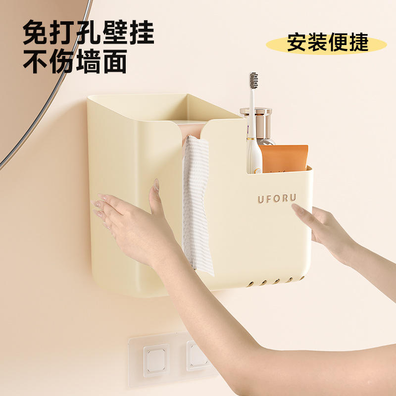 Caja de pañuelos montada en la pared, almacenamiento rectangular multifuncional de plástico para baño con soporte para cepillos de dientes, diseño duradero