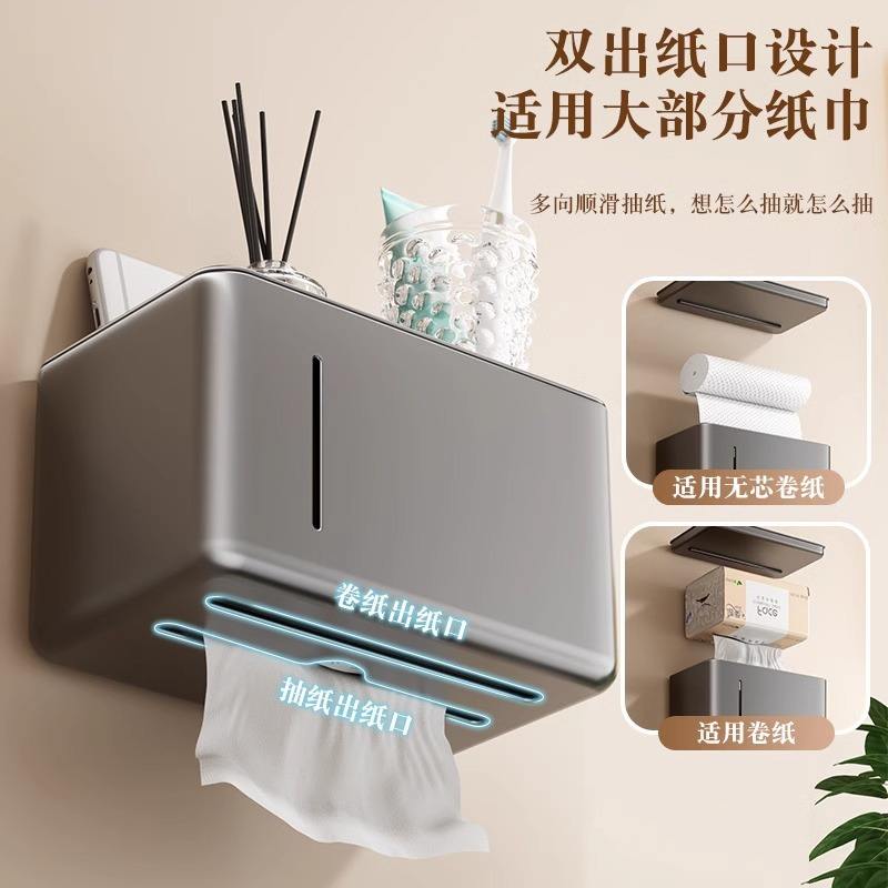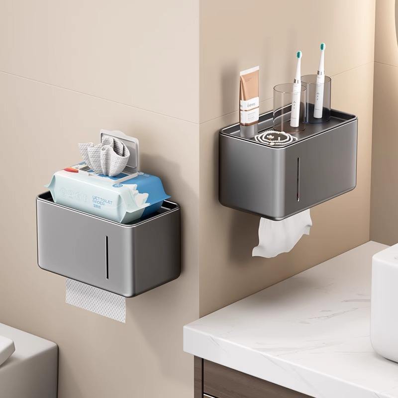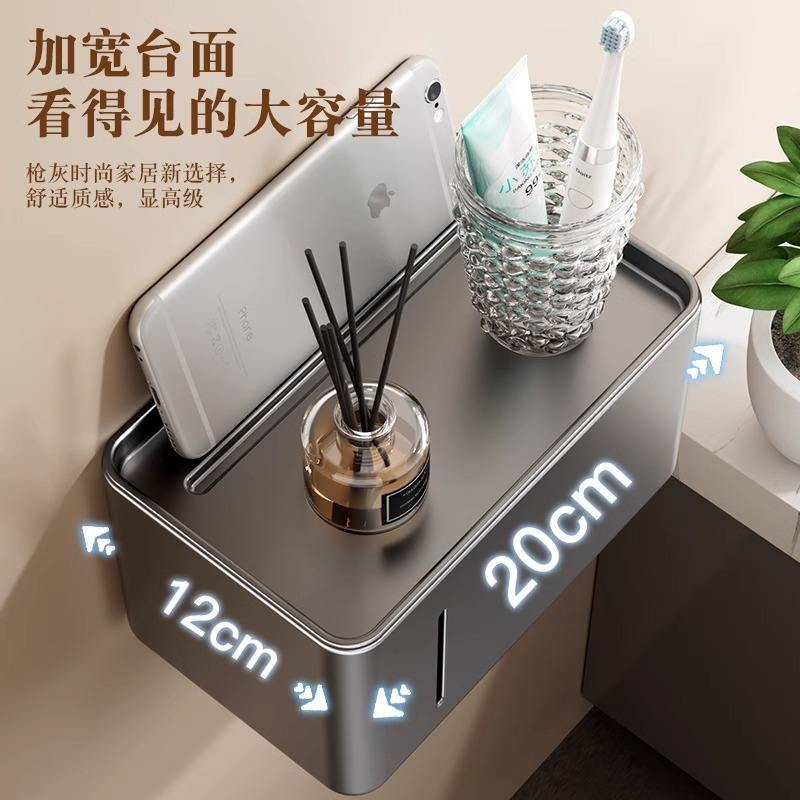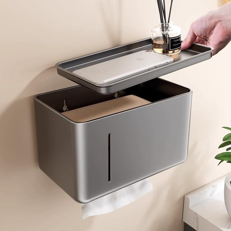 Portarrollos de papel higiénico rectangular para montar en la pared, color gris, duradero, con bandeja para almacenamiento.