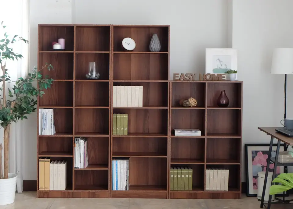 Estantes de libros abiertos de 6 rejillas de color nogal, organizador de cubos, librería de madera, almacenamiento compacto, ofertas directas de fábrica