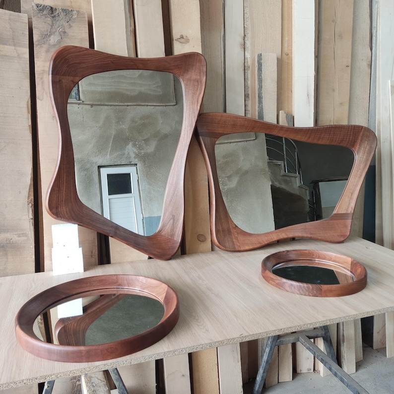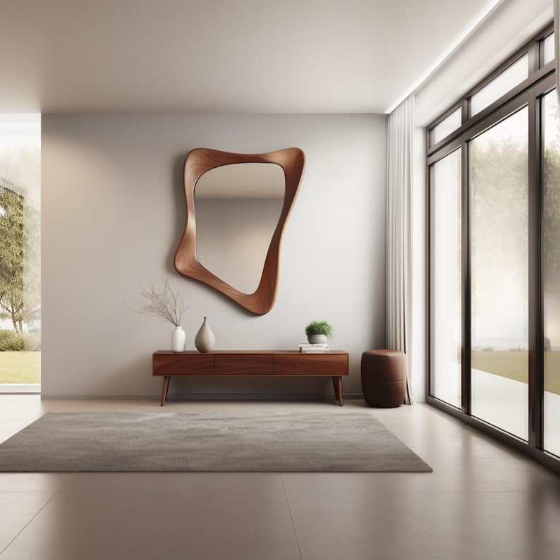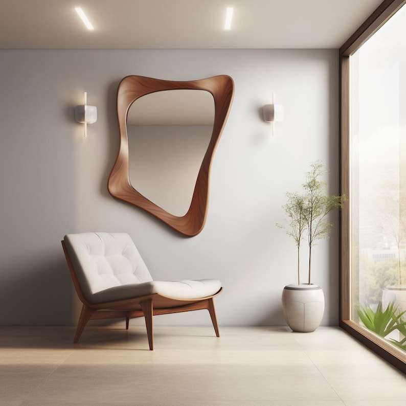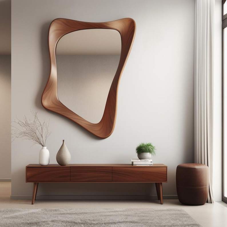 Nogal mediados de siglo moderno asimétrico entrada de madera espejo de pared decoración única para el hogar estilo Art Deco hecho a mano por el artista