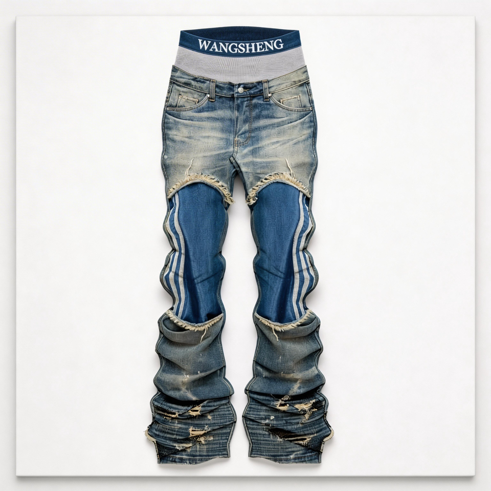 Vaqueros de mezclilla para hombre WangSheng de tiro medio, con patchwork oscuro y claro, desgastados, rotos, con paneles a rayas, apilados, de corte regular, estilo vintage Y2K