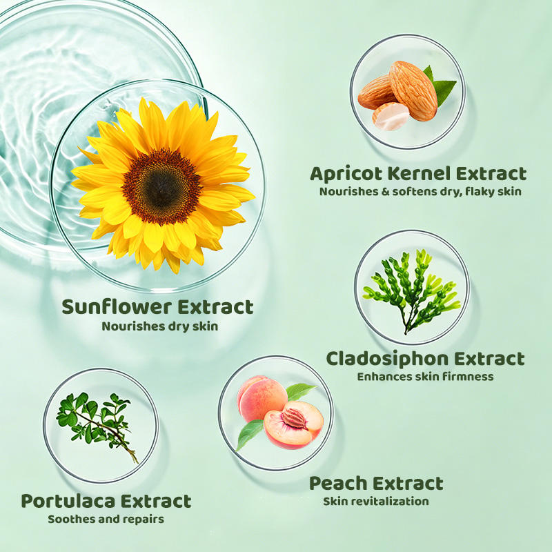 mentol, Polvo de cáscara de nuez pecana, Extracto de Fruta de Coco, Extracto de Semilla de Albaricoque, Extracto de Melocotón, Extracto de Manzanilla Dorada, Extracto de Salvado de Avena, Extracto de Aloe Vera, Éter butílico de vainillina, ColágenoIngrediente