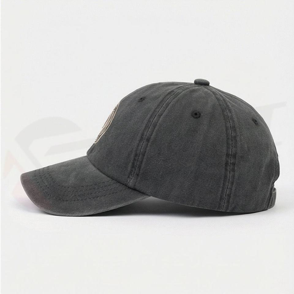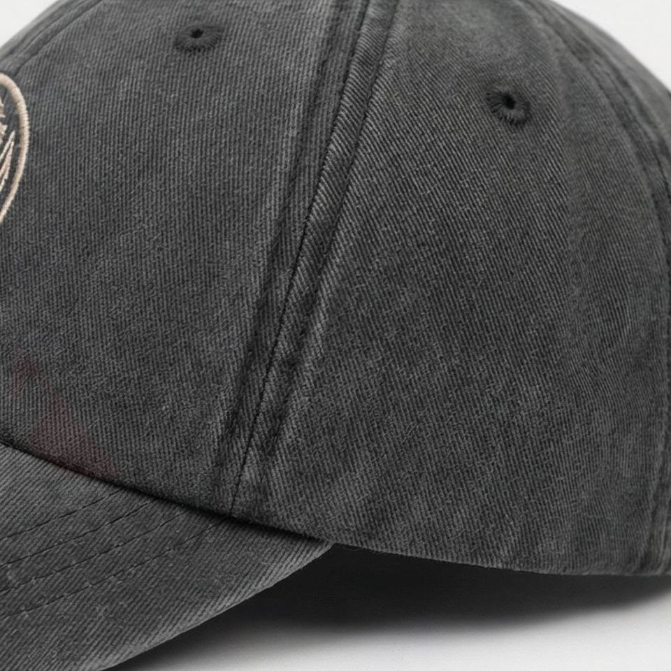 Gorra de béisbol de mezclilla negra lavada con emblema de nudo circular bordado, diseño para mujer, estilo moderno, cómoda y a la moda.