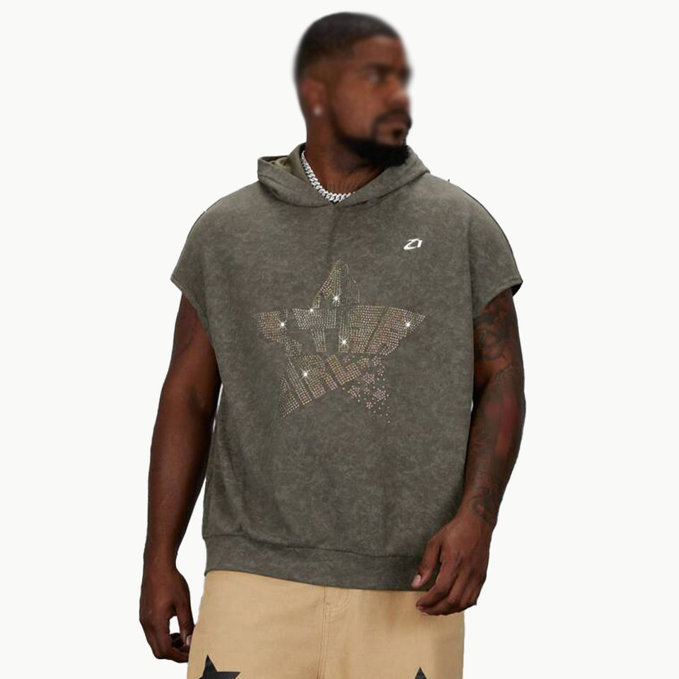 Sudadera sin mangas de algodón lavado con estrellas de diamantes de imitación, estilo urbano oversize, estilo gimnasio, proveedor de producción de ropa personalizada