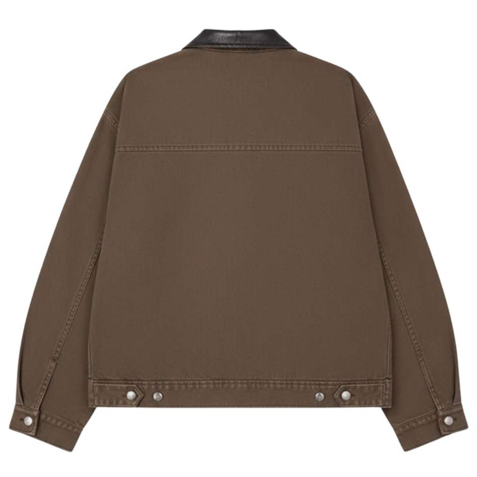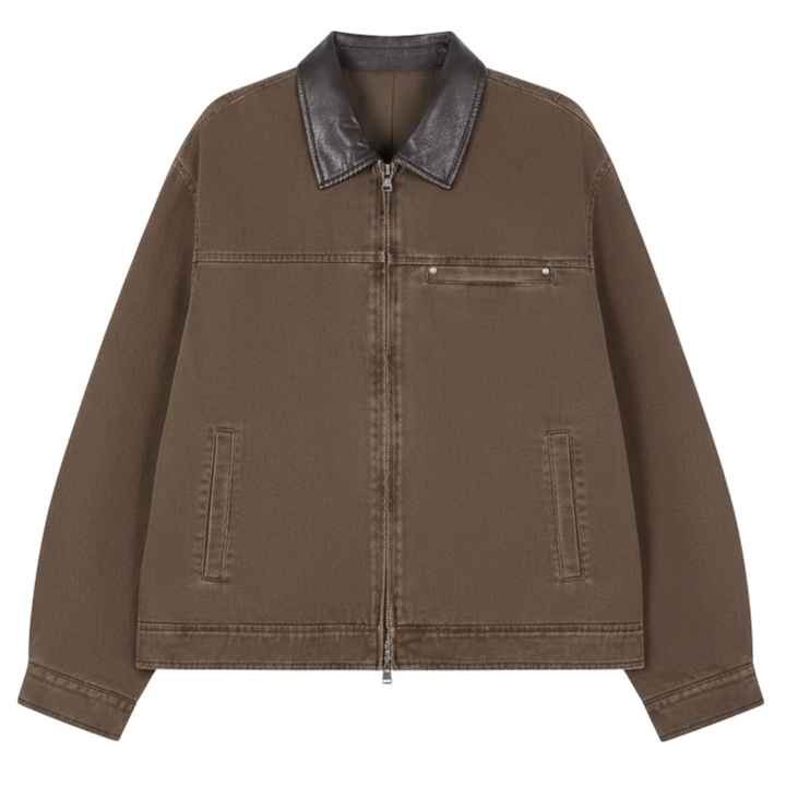 Chaqueta Acolchada de Sarga Lavada para Hombre, Ligera con Cremallera y Cuello de Cuero, Chaqueta de Moda en Marrón