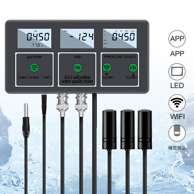 Medidor de Calidad del Agua 8 en 1, pH, ORP, PPM, EC, Salinidad, TDS, G/C, con Monitor en Línea por Wi-Fi para Uso Acuático e Industrial