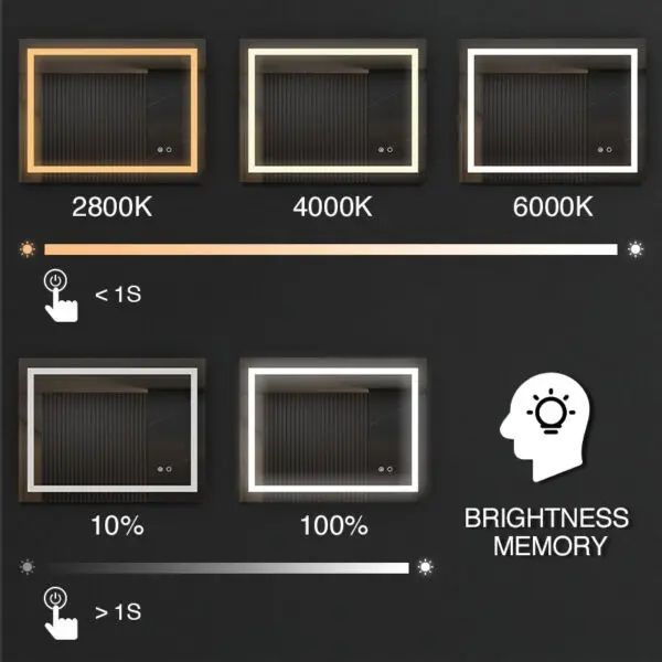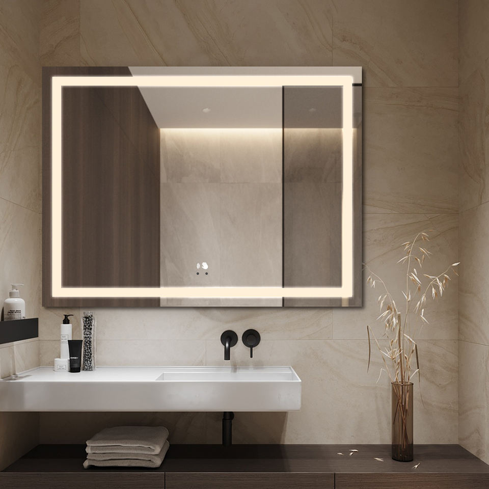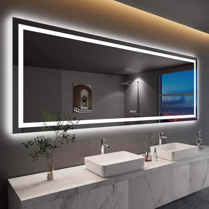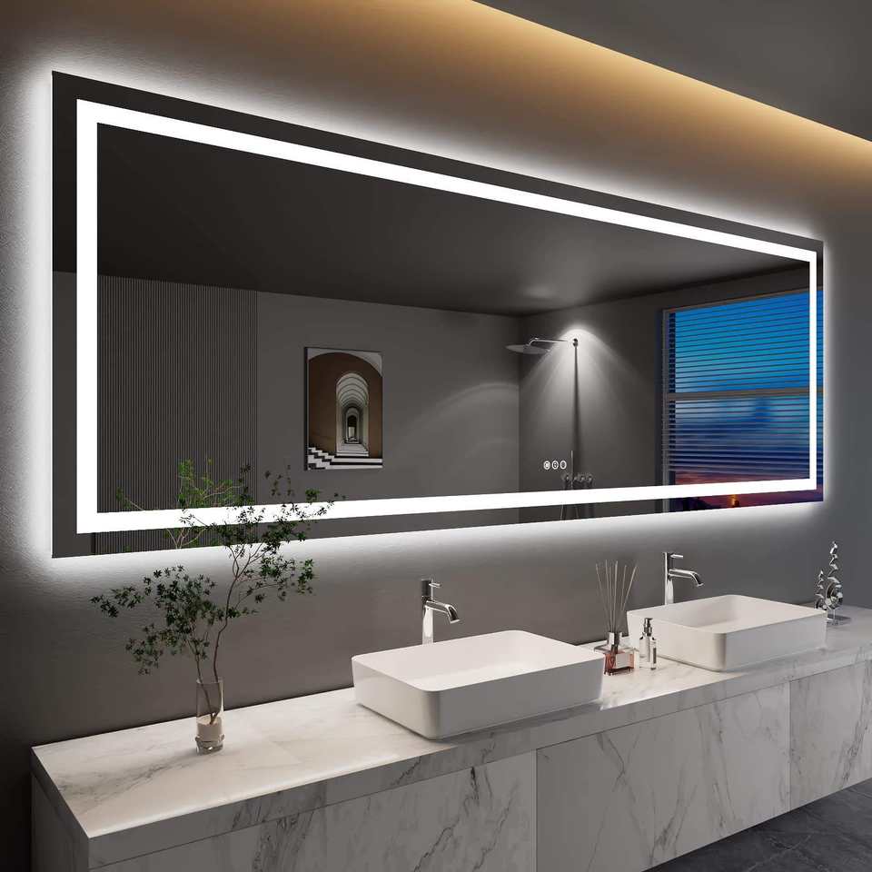 Espejo rectangular grande impermeable con antivaho, iluminación LED e interruptor táctil para baño