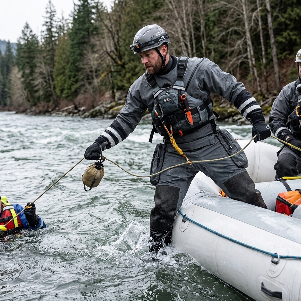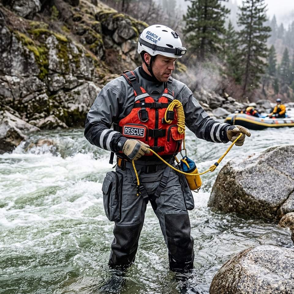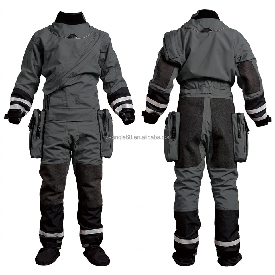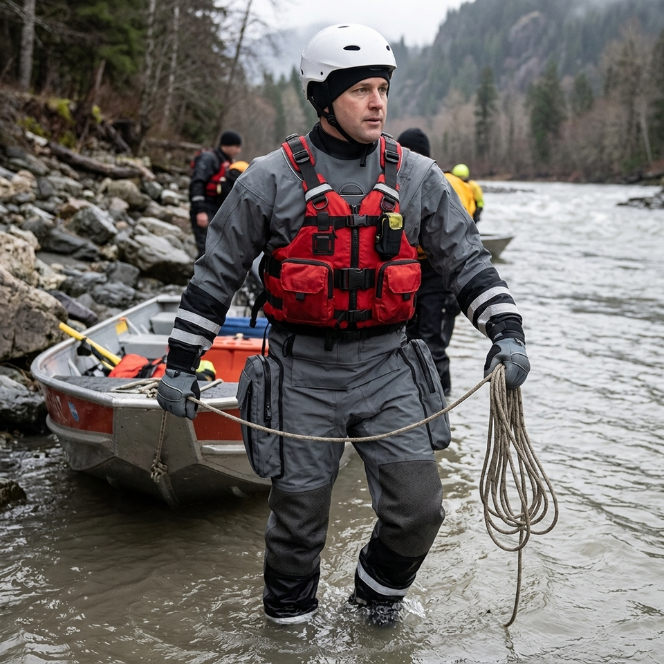 Traje de Rescate Impermeable y Ligero, Ajuste Ergonómico, Protección de Rodilla de Kevlar, Selladores SI-TECH, Cierre de Cremallera en el Pecho