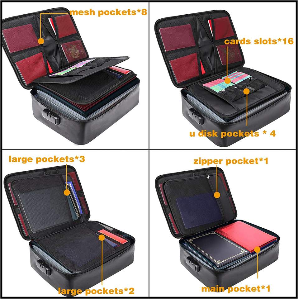 Bolsa organizadora de documentos ignífuga de seguridad de poliéster impermeable con cerradura para tarjetas familiares y almacenamiento de dinero