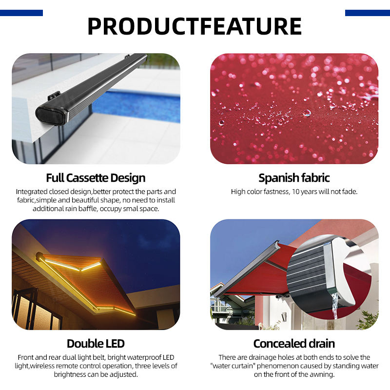 Aplicación:Balcón, Hotel, Al aire libre, Comercial, Playa, Camping, Jardín, Patio trasero, Protección solar, Parasol, Toldo retractable, A prueba de agua, Eléctrico, Dosel de lluvia, Decorativo, Protección contra la lluvia, Terraza, Cenador, Iluminación LED, Patio al aire libre, Jardín al aire libre, Toldos motorizados de la pérgola, Protección UV, CAFÉ TIENDA, Residencial, Natación piscina, VILLA