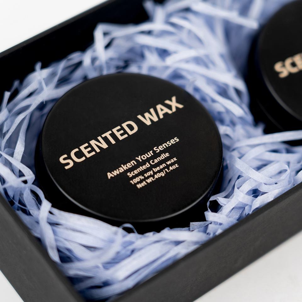 Un kit incluye:Vela 100% de cera de soja 40g*2, caja de regalo*1, rafia*1, tarjeta de felicitación en blanco*1
